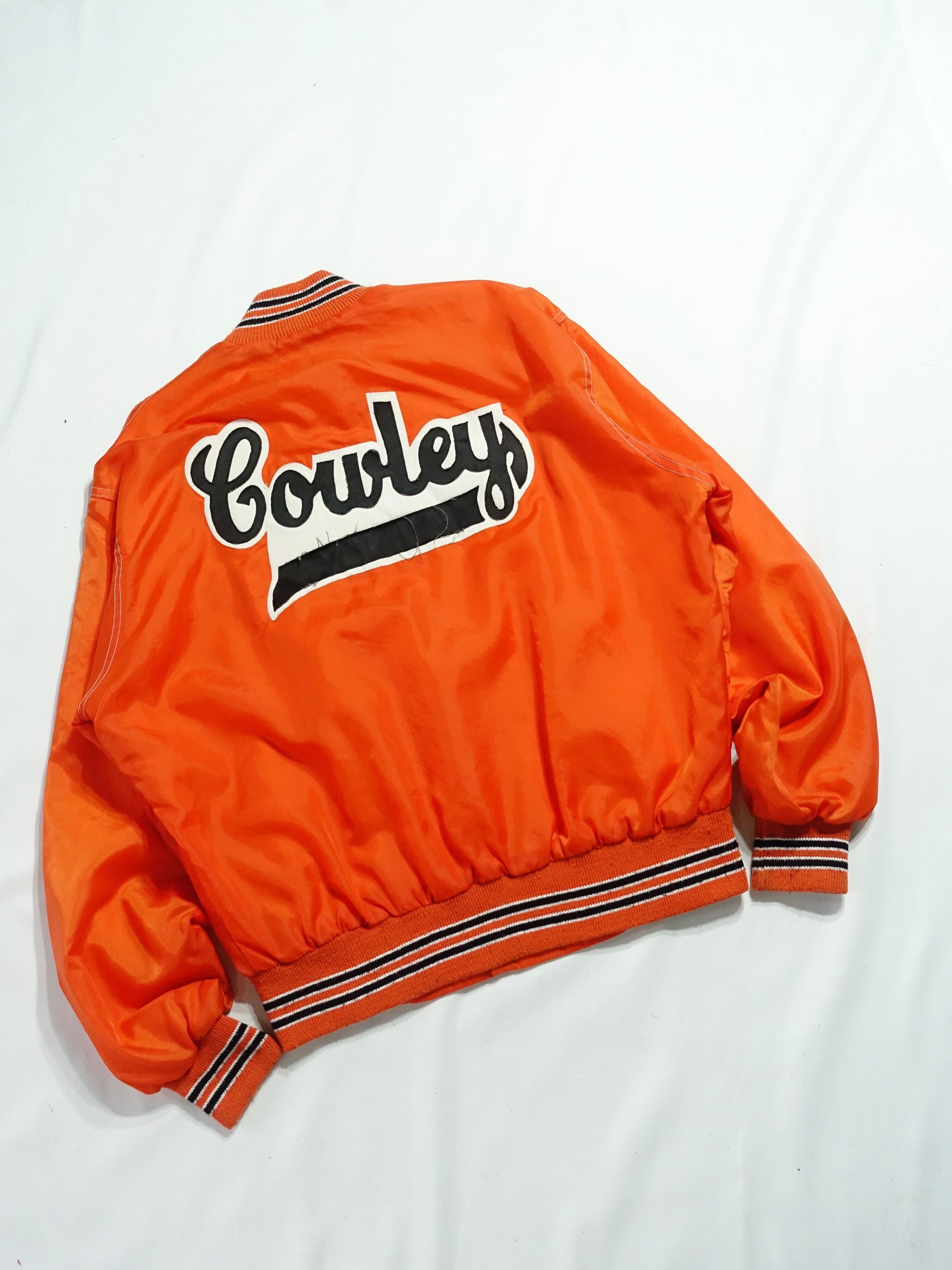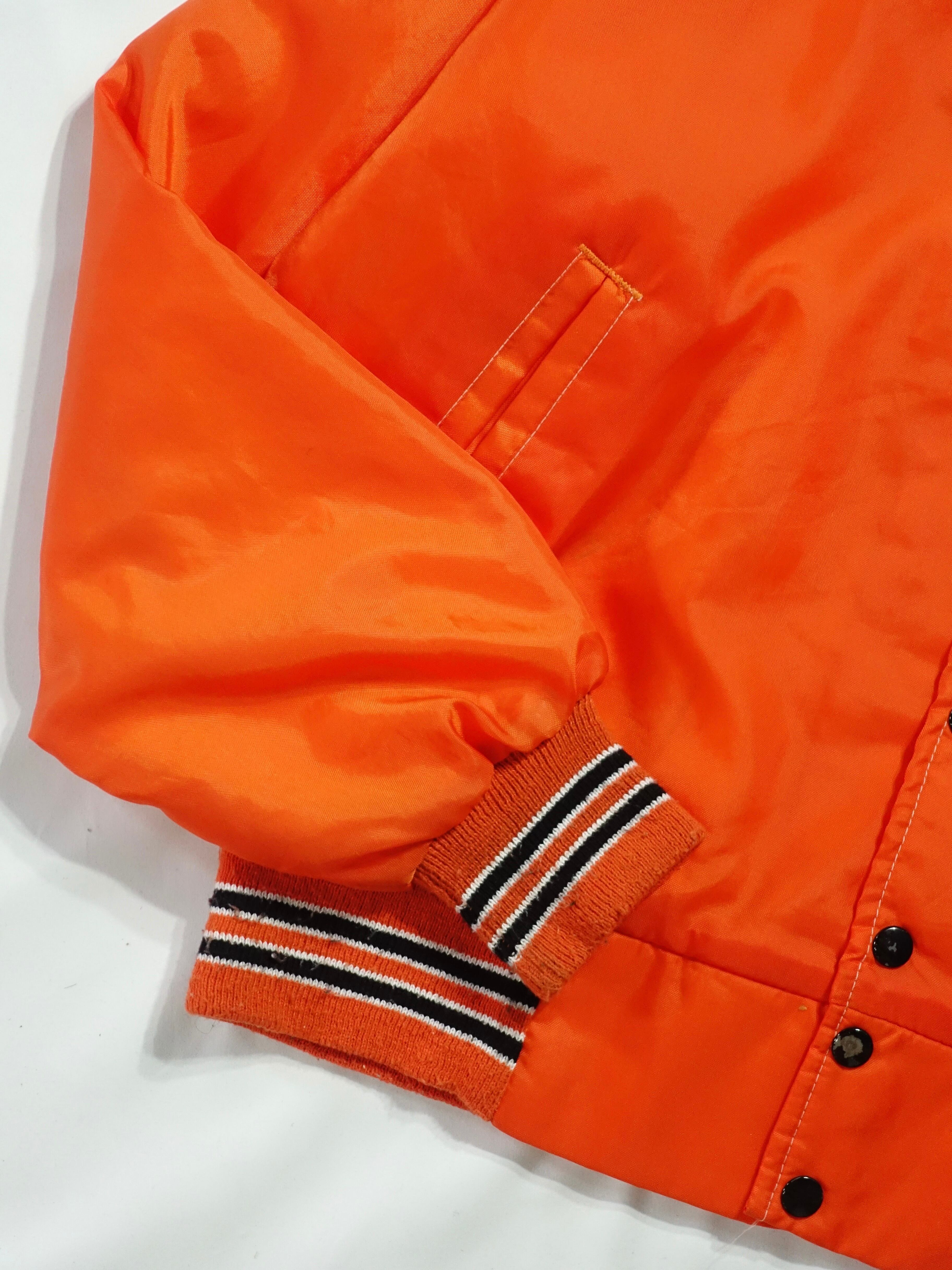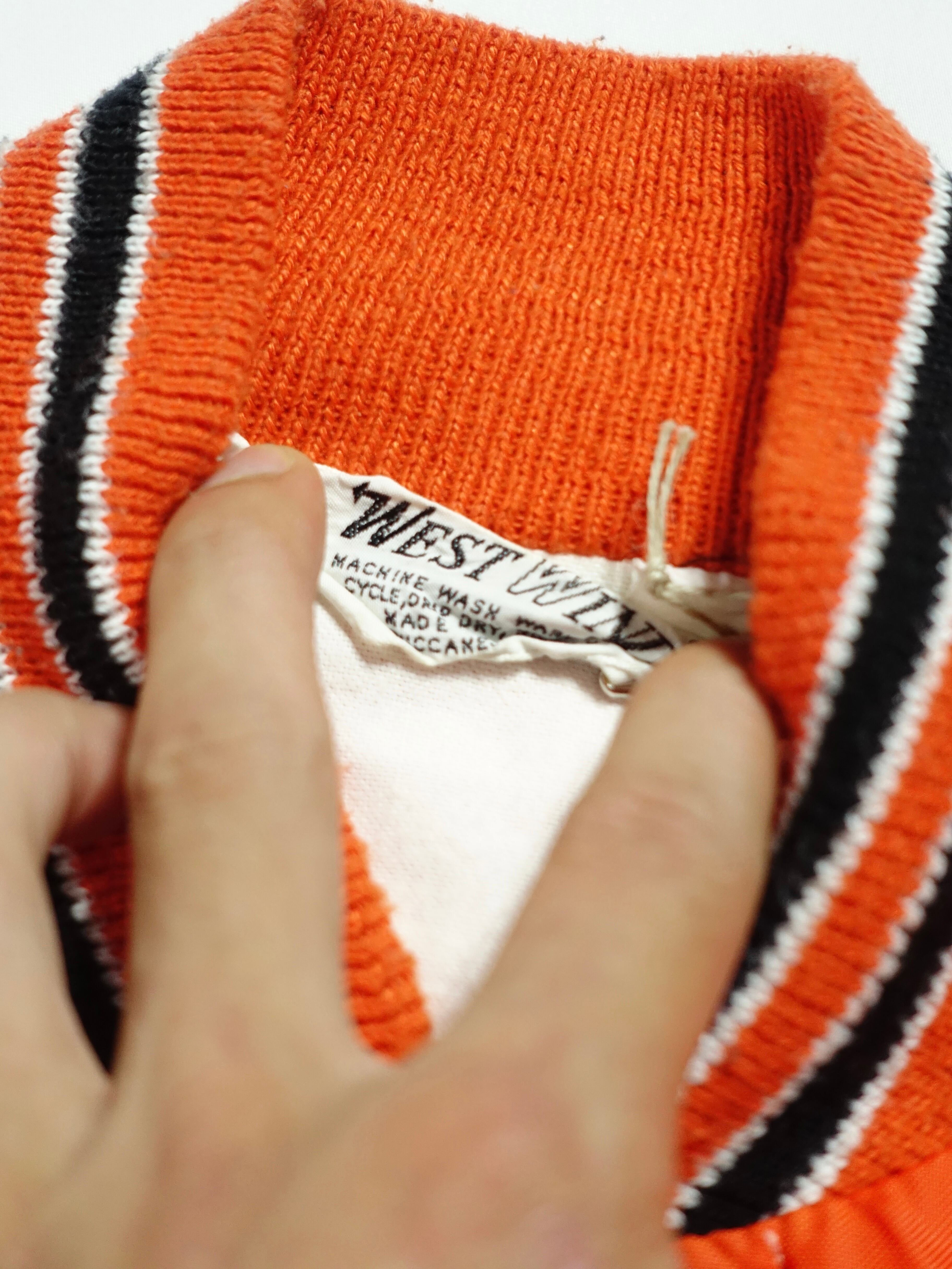 鮮やかなオレンジのボディに、裏地はコットンを採用した仕様で、当時のアメリカ製スクールジャケットらしい質感が特徴です。