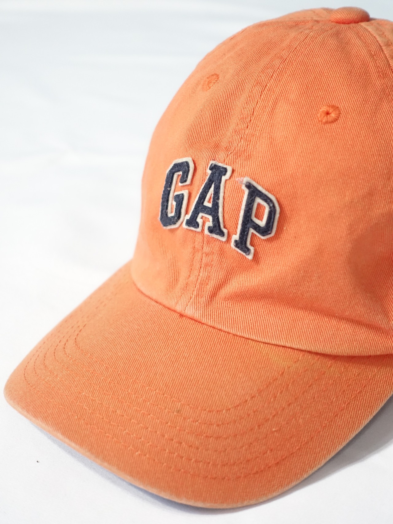 鮮やかなオレンジボディにアーチ型の“GAP”ロゴ刺繍を配したクラシックな6パネルキャップ。