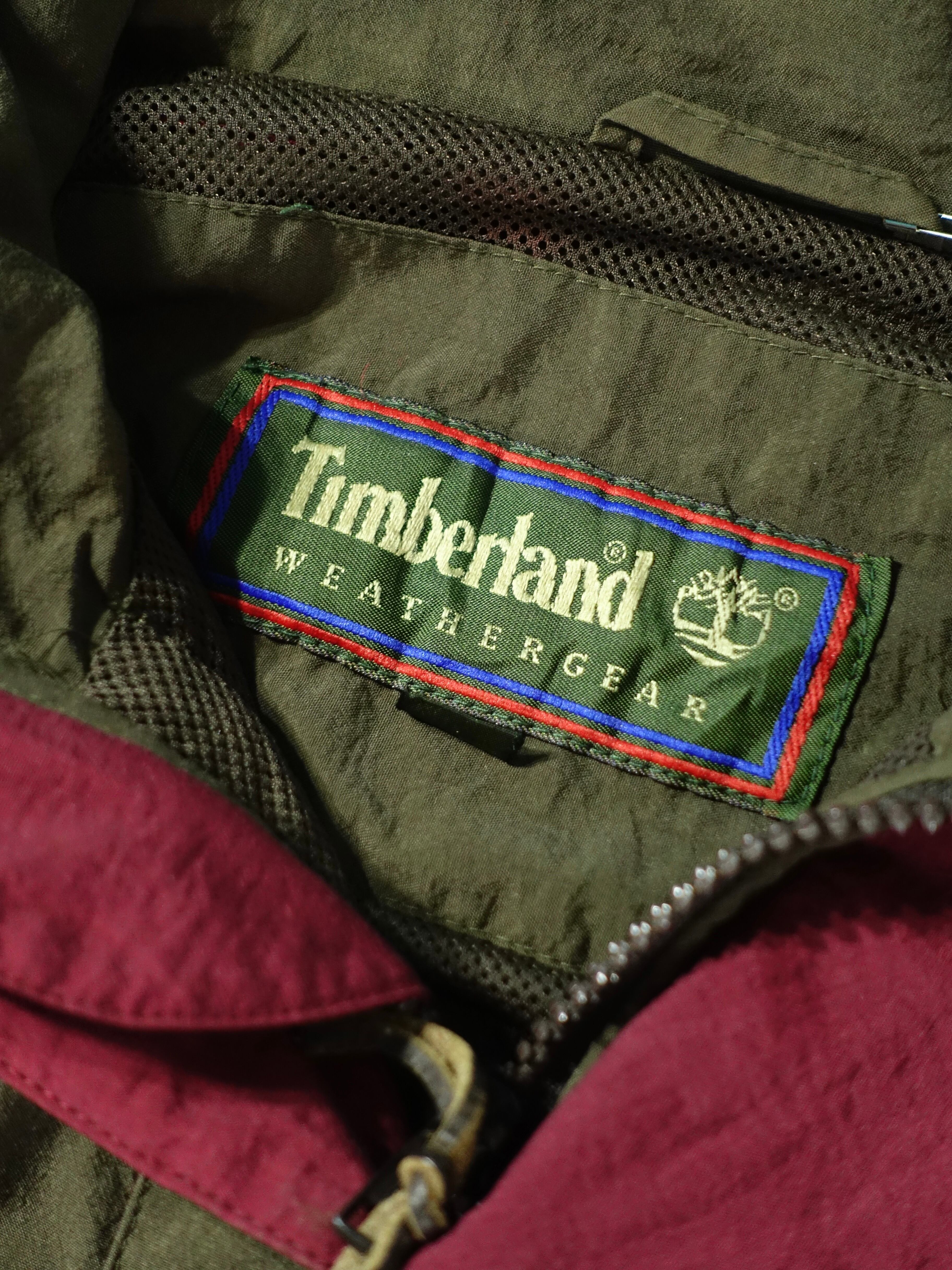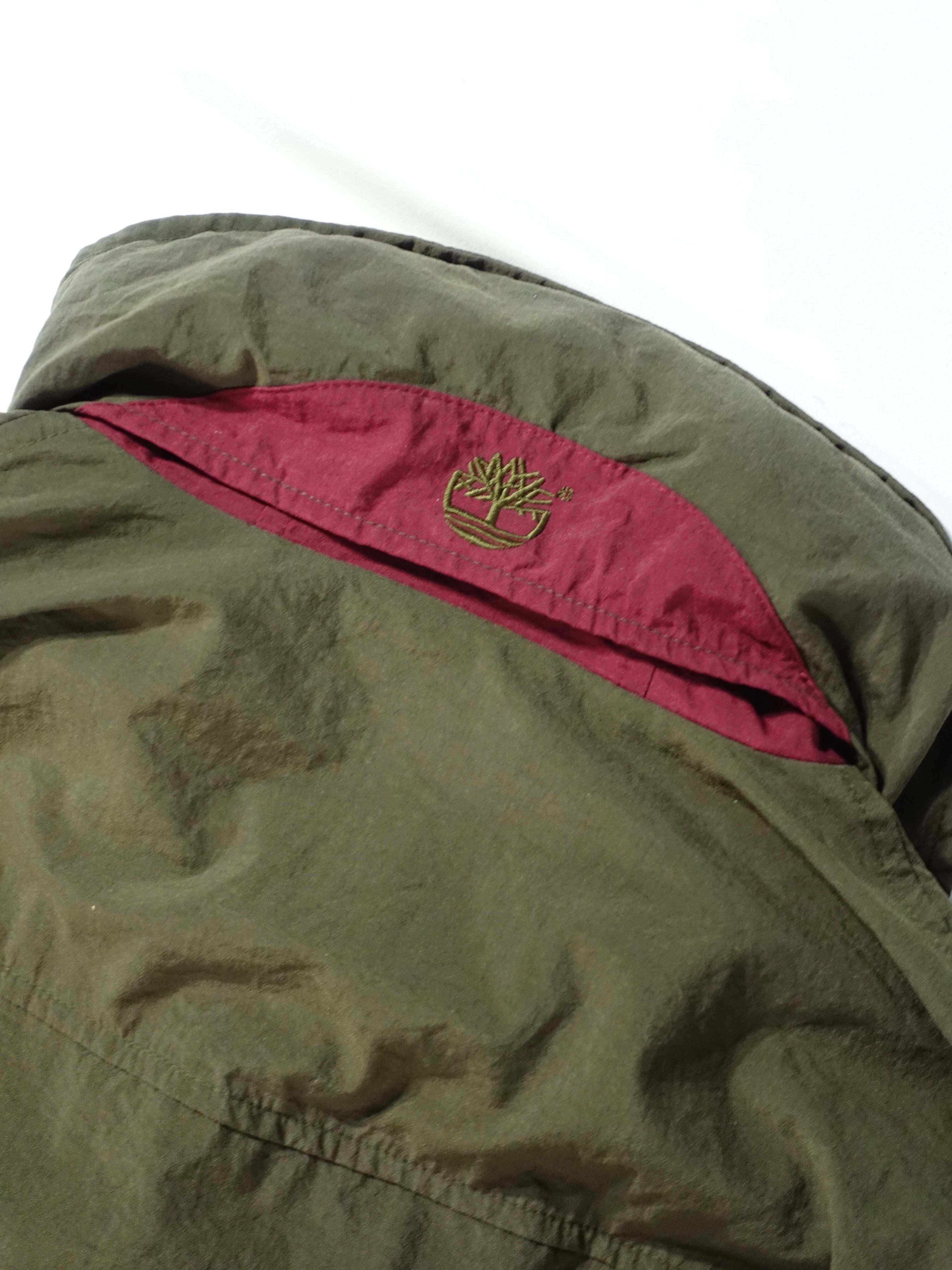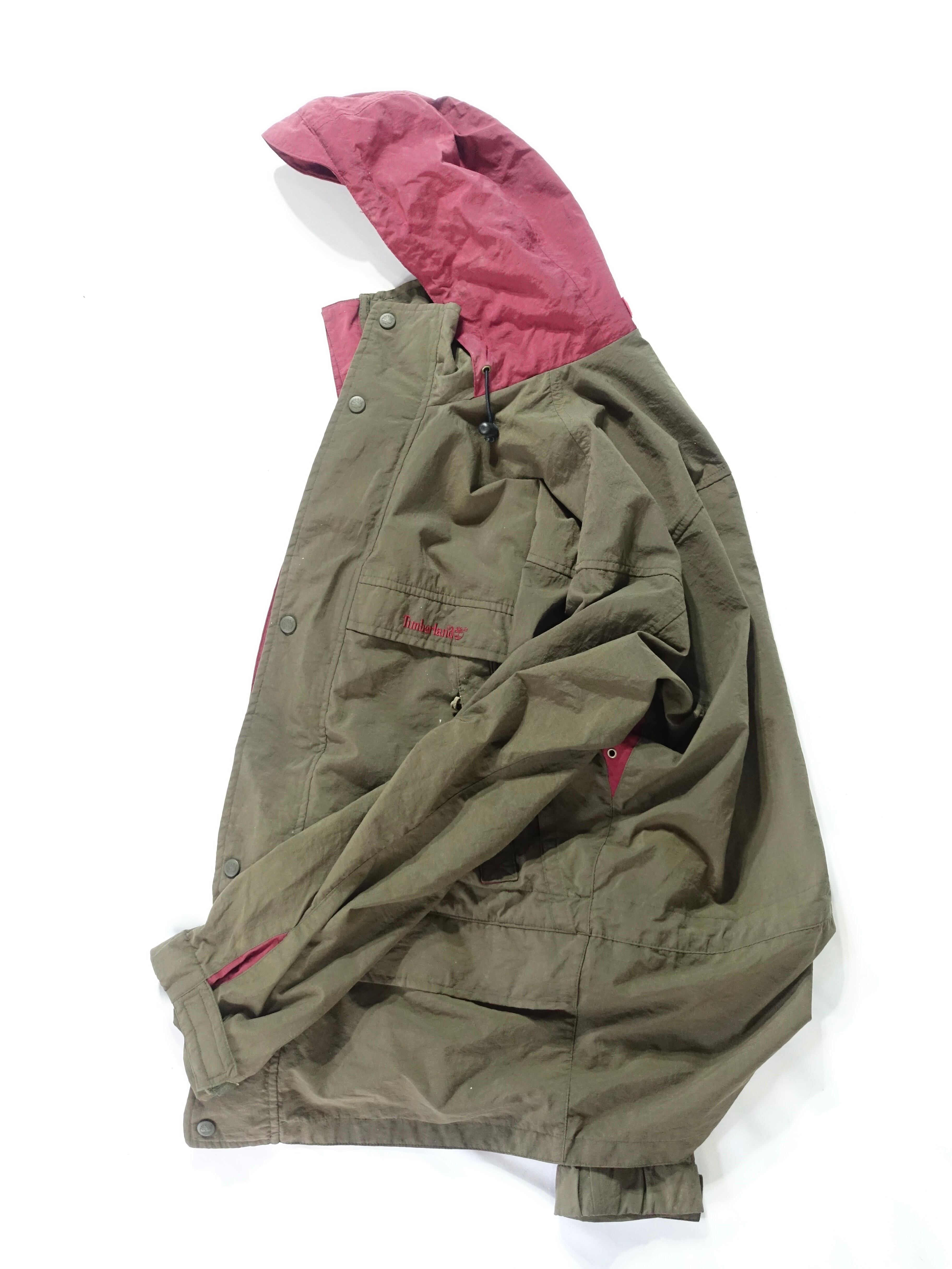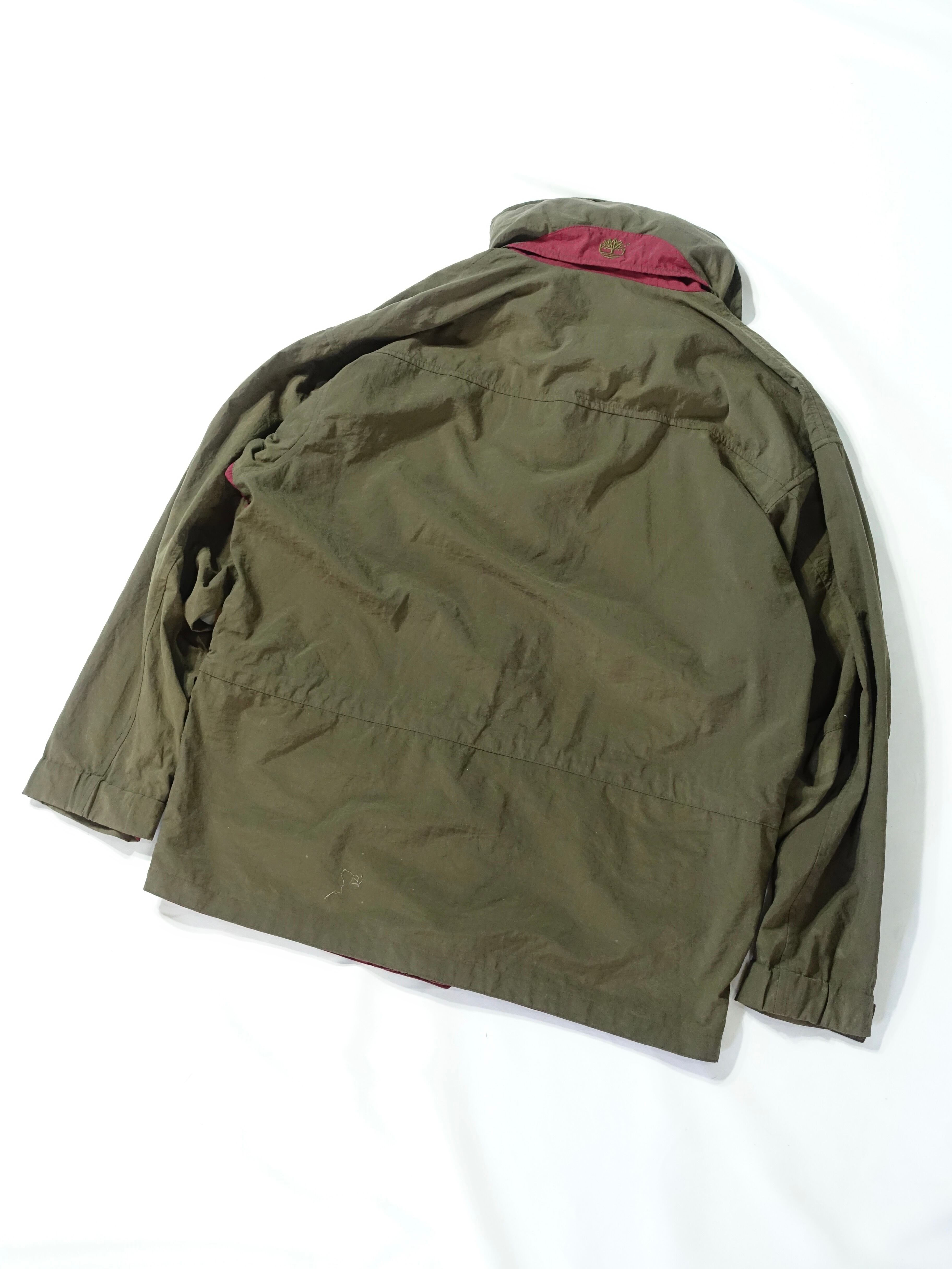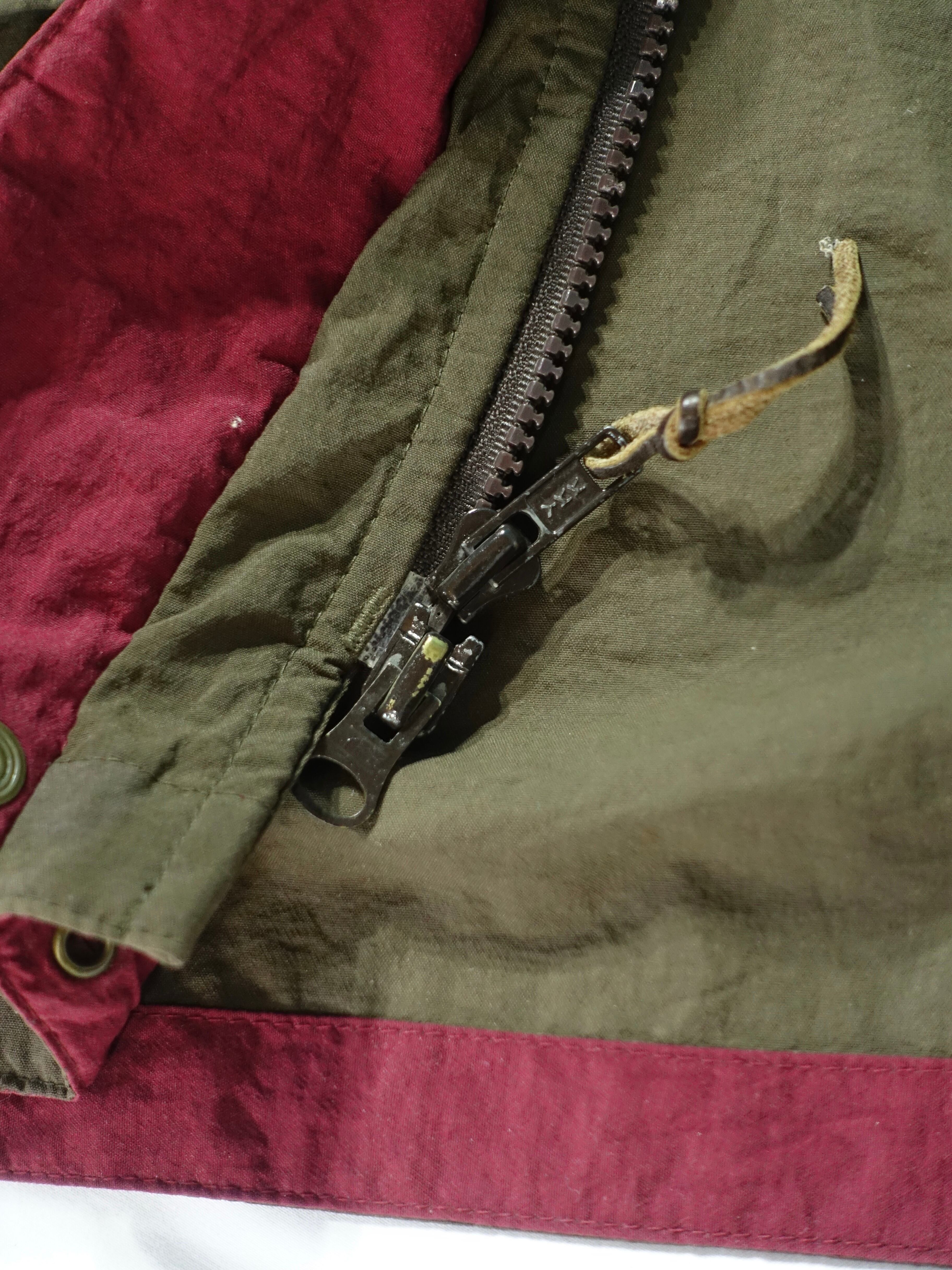 オリーブ × ワインレッドの切替配色は当時のアウトドアブランドに多く見られたトーン。裏地にはメッシュを配し、通気性を確保した本格的なアウトドア仕様です。