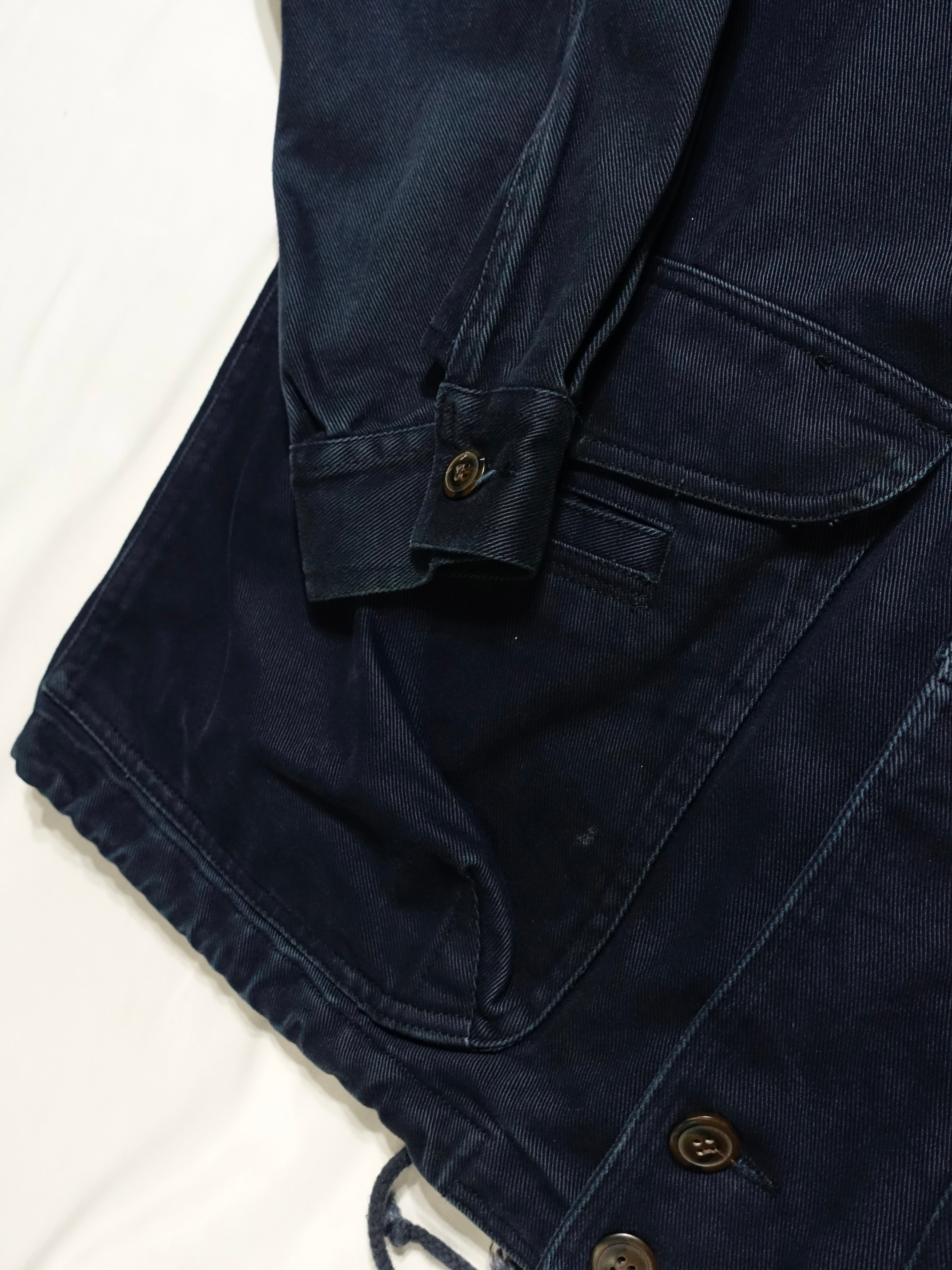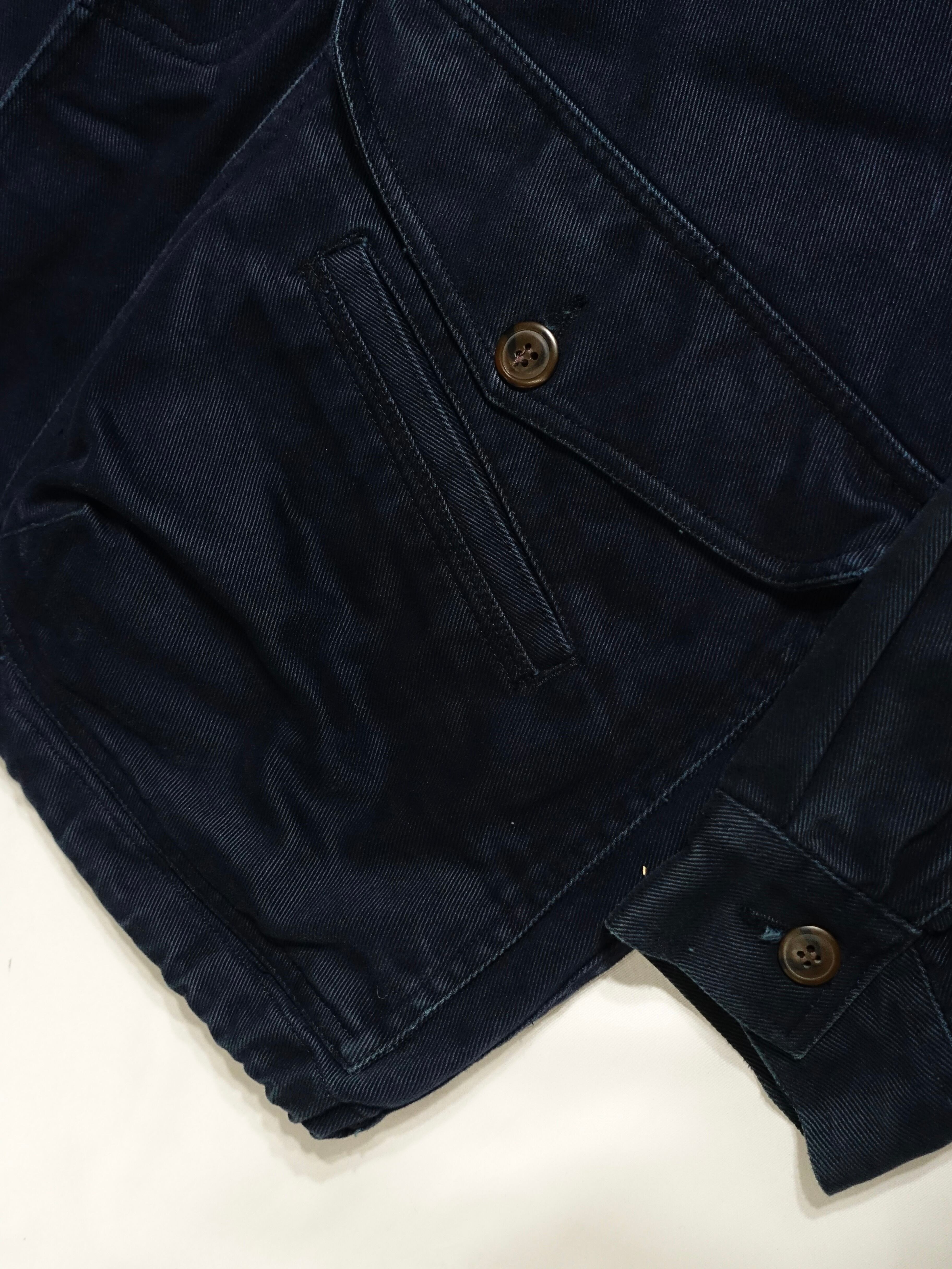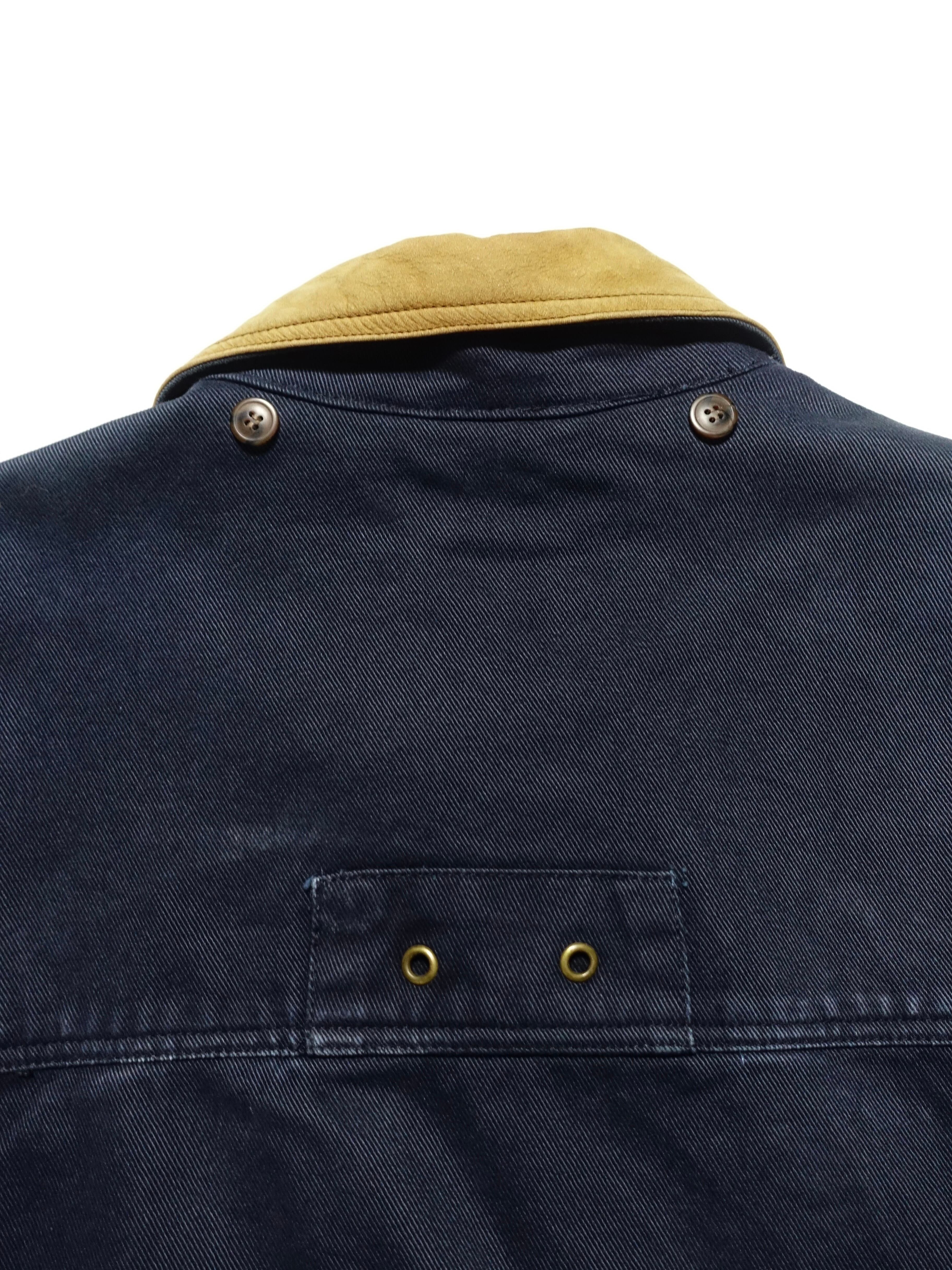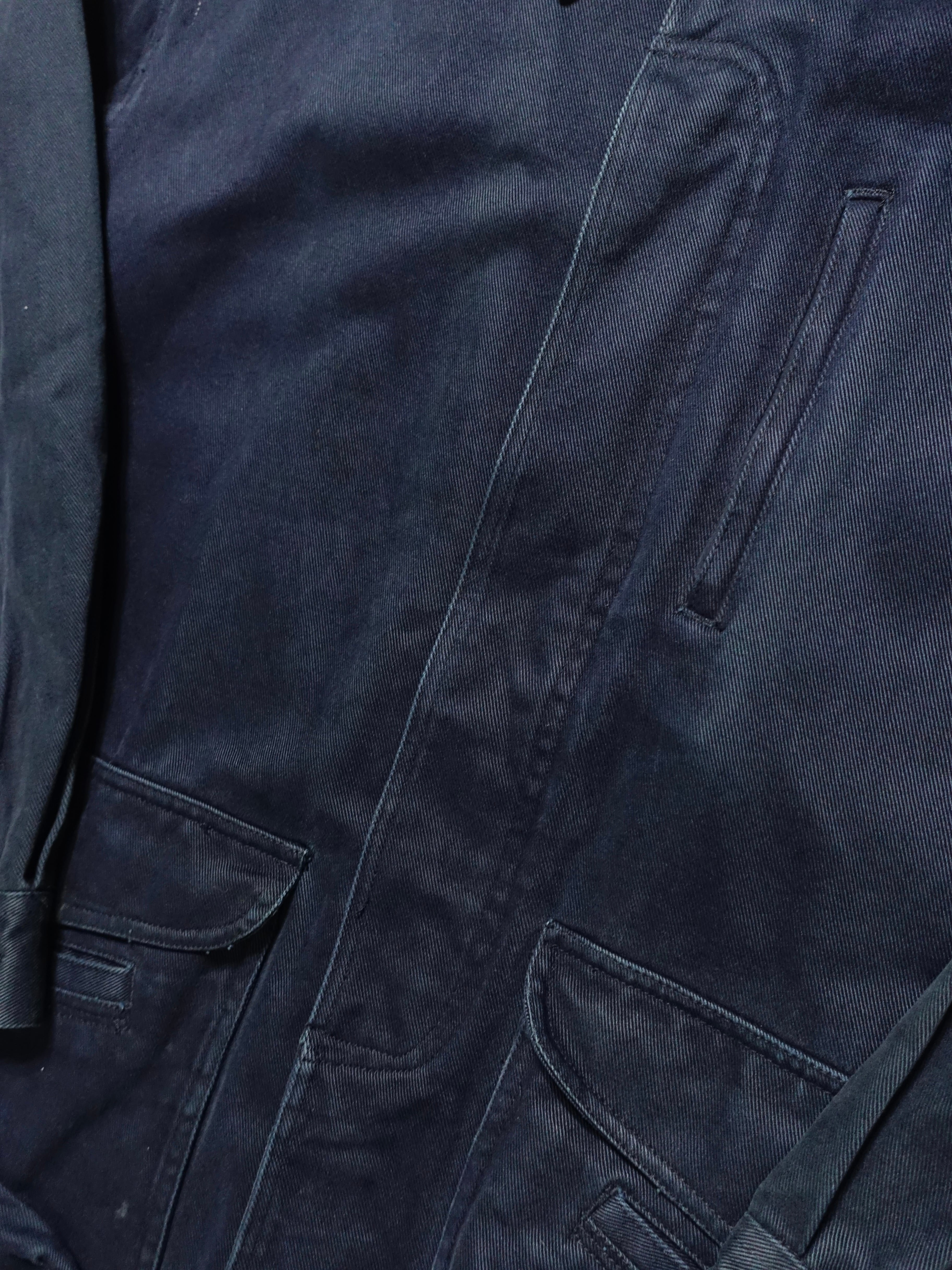 ネイビーのヘリンボーン柄のような織りの生地に、ブラウンのレザーの襟が映える、洗練されたデザイン。