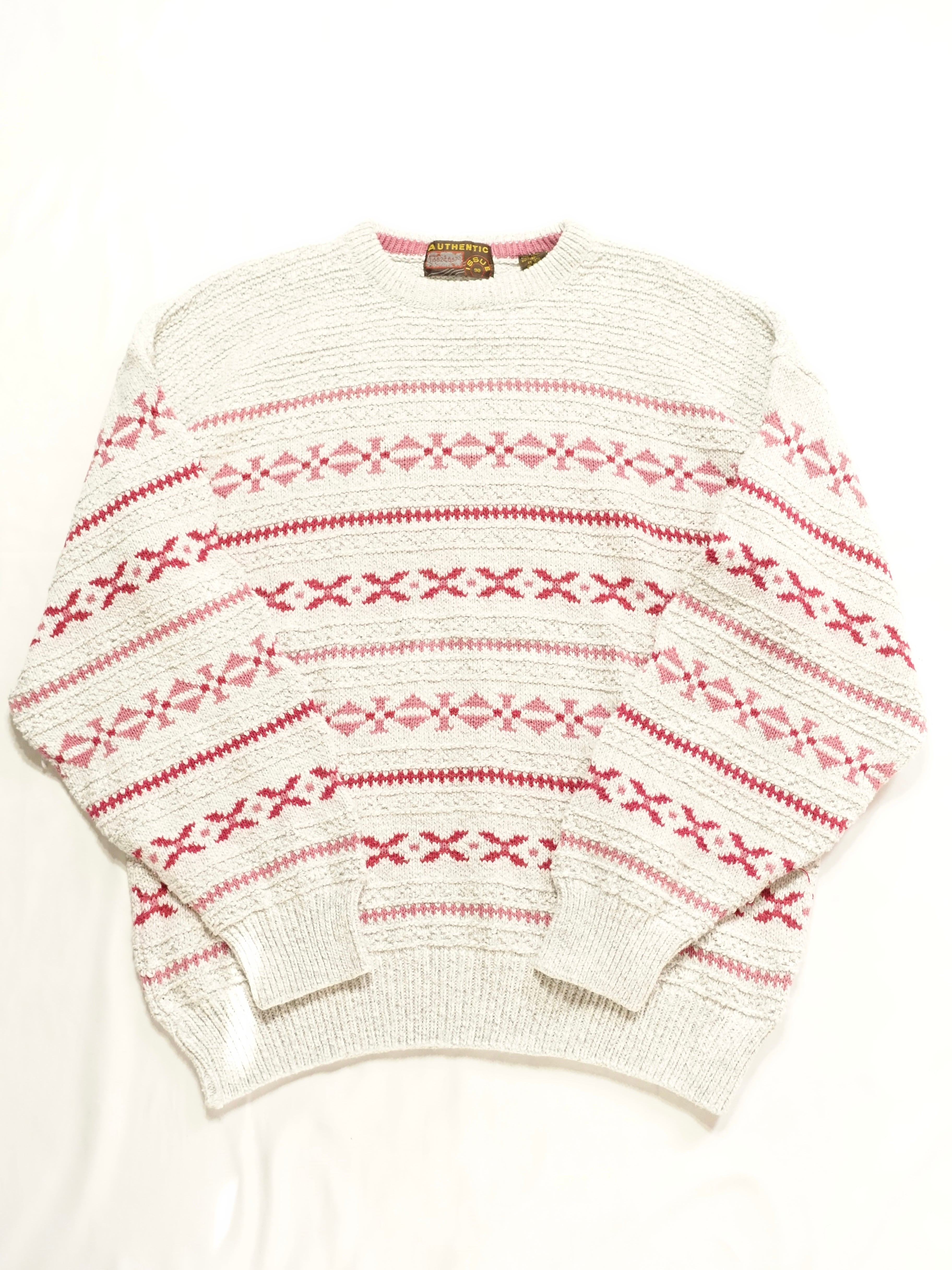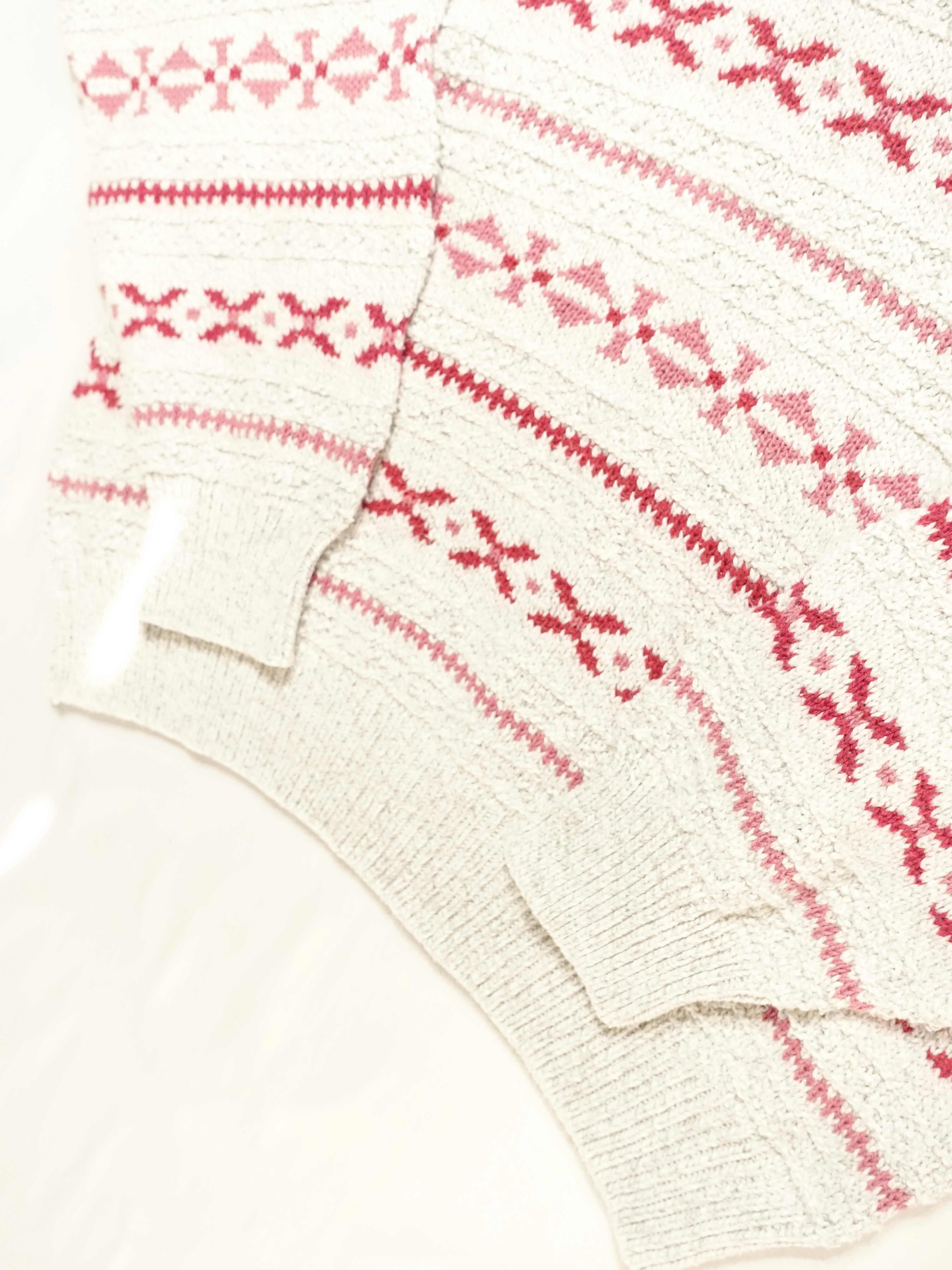 グレーのベースカラーに、淡いピンクと赤で描かれたフェアアイル柄が目を引く一枚。