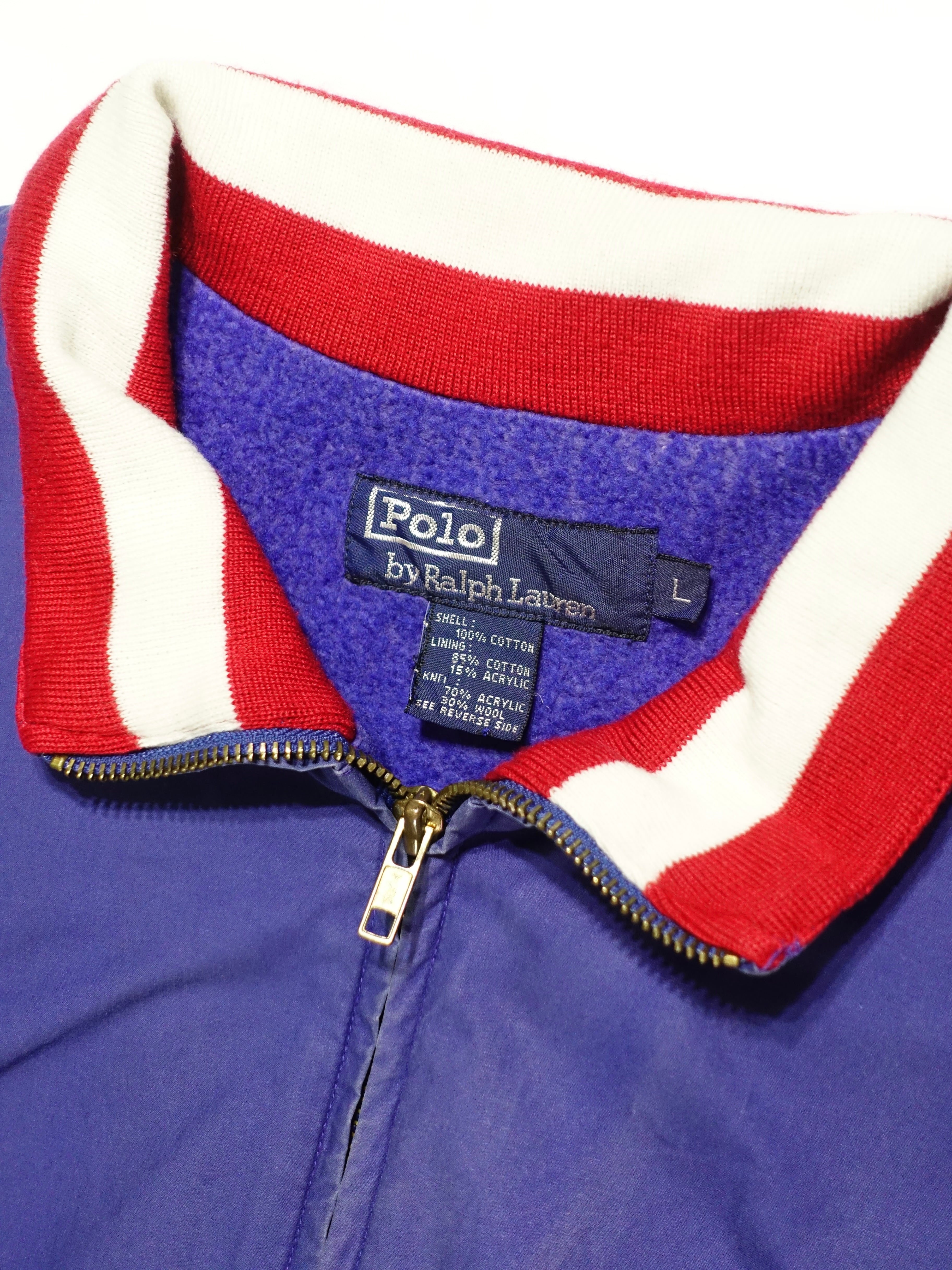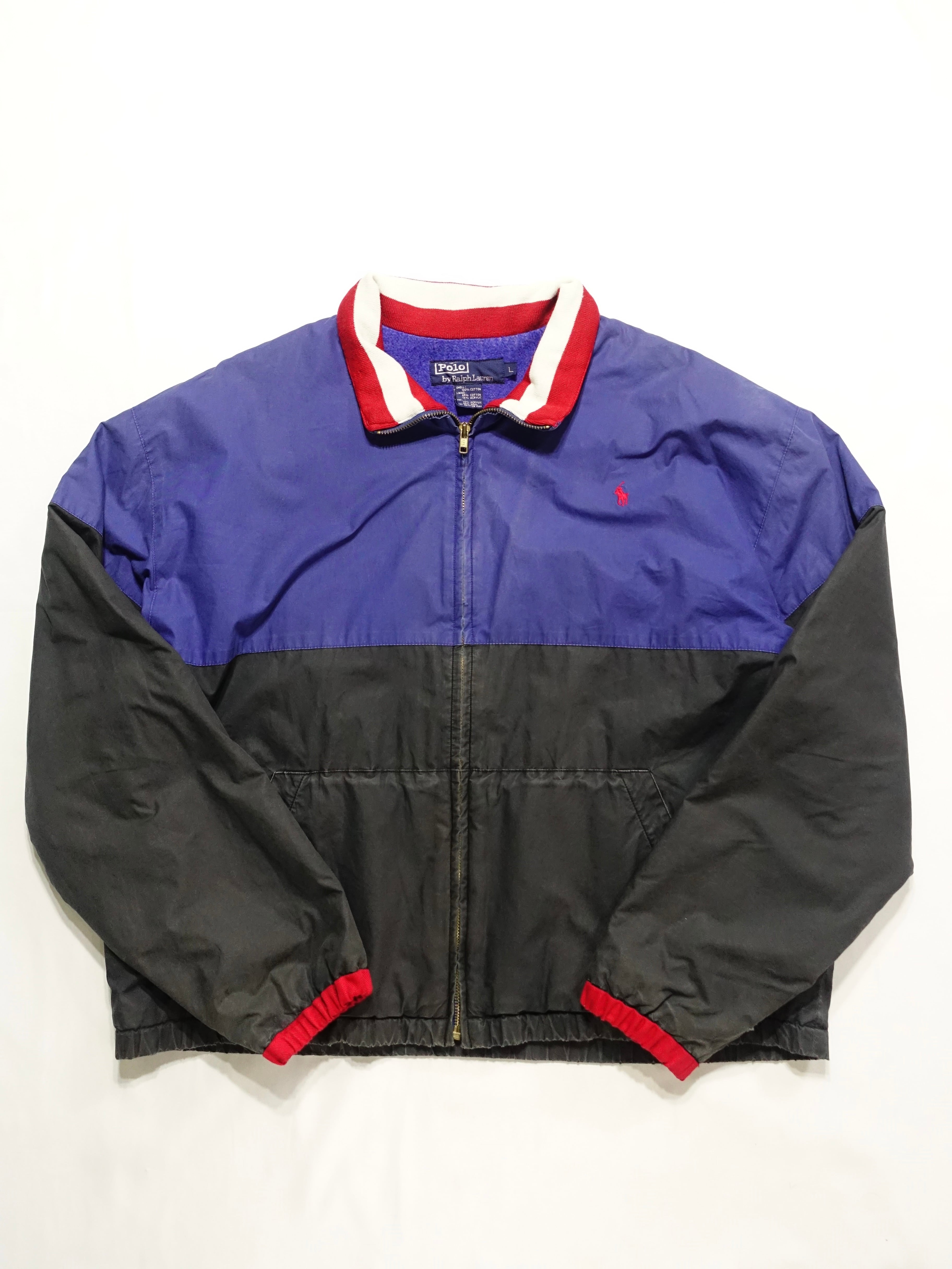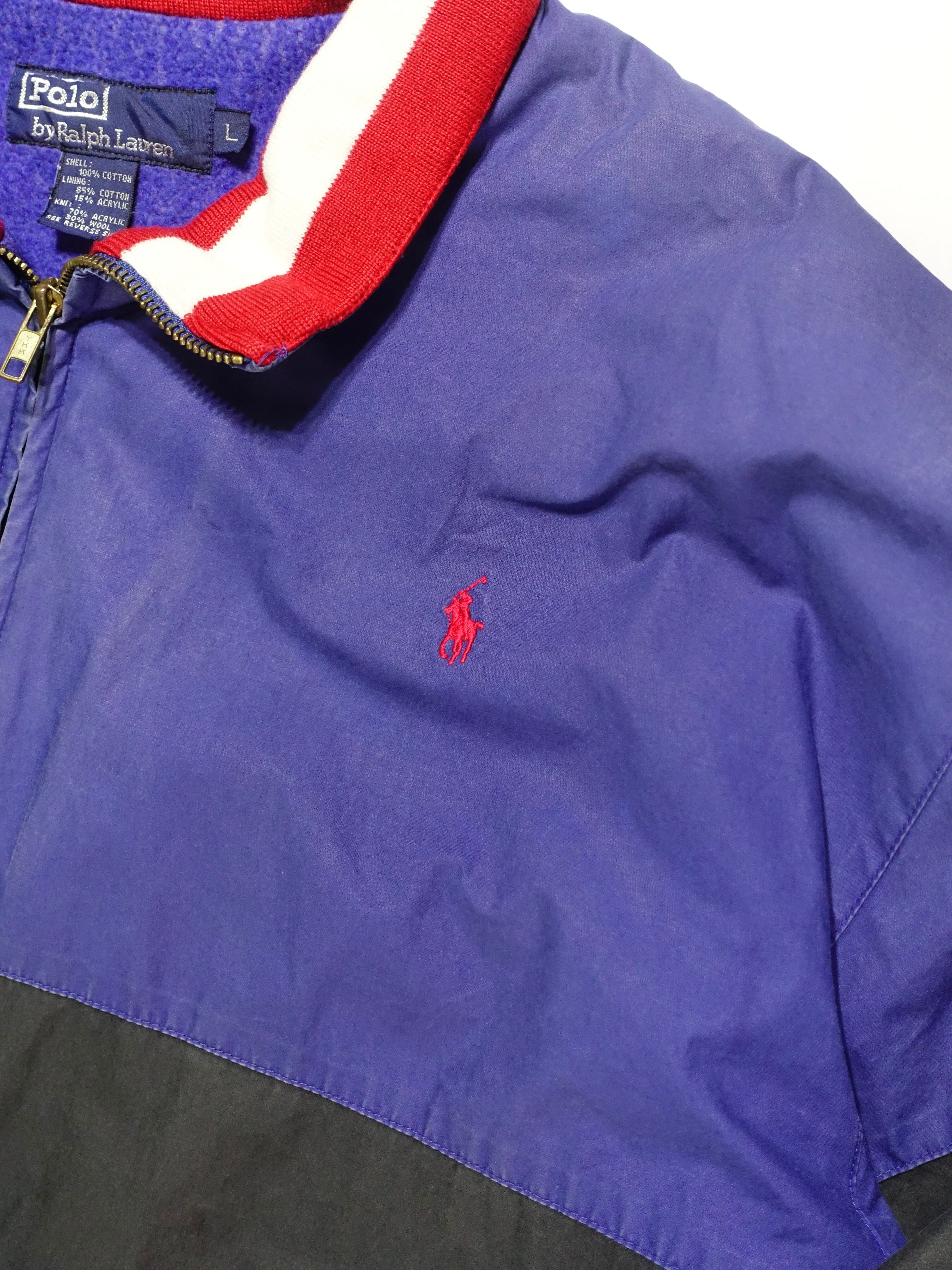ネイビーとブラックのツートーンで切り替えられたボディに、胸元のレッドのポニーロゴ刺繍が映える、90年代らしいカラーリングが魅力的な一枚。