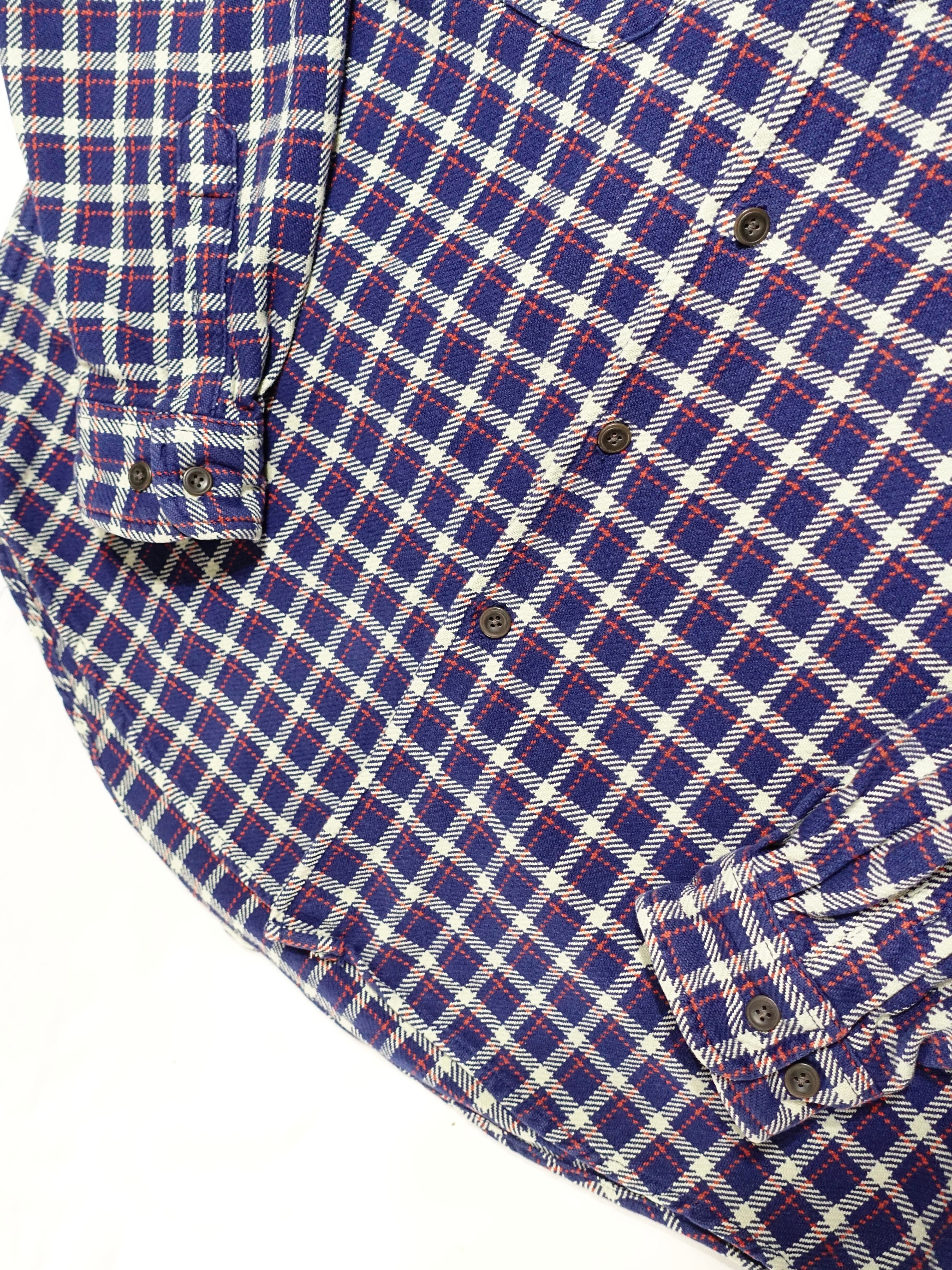 落ち着いたネイビーを基調に、ホワイトとレッドのラインが交差する洗練されたチェックパターン。