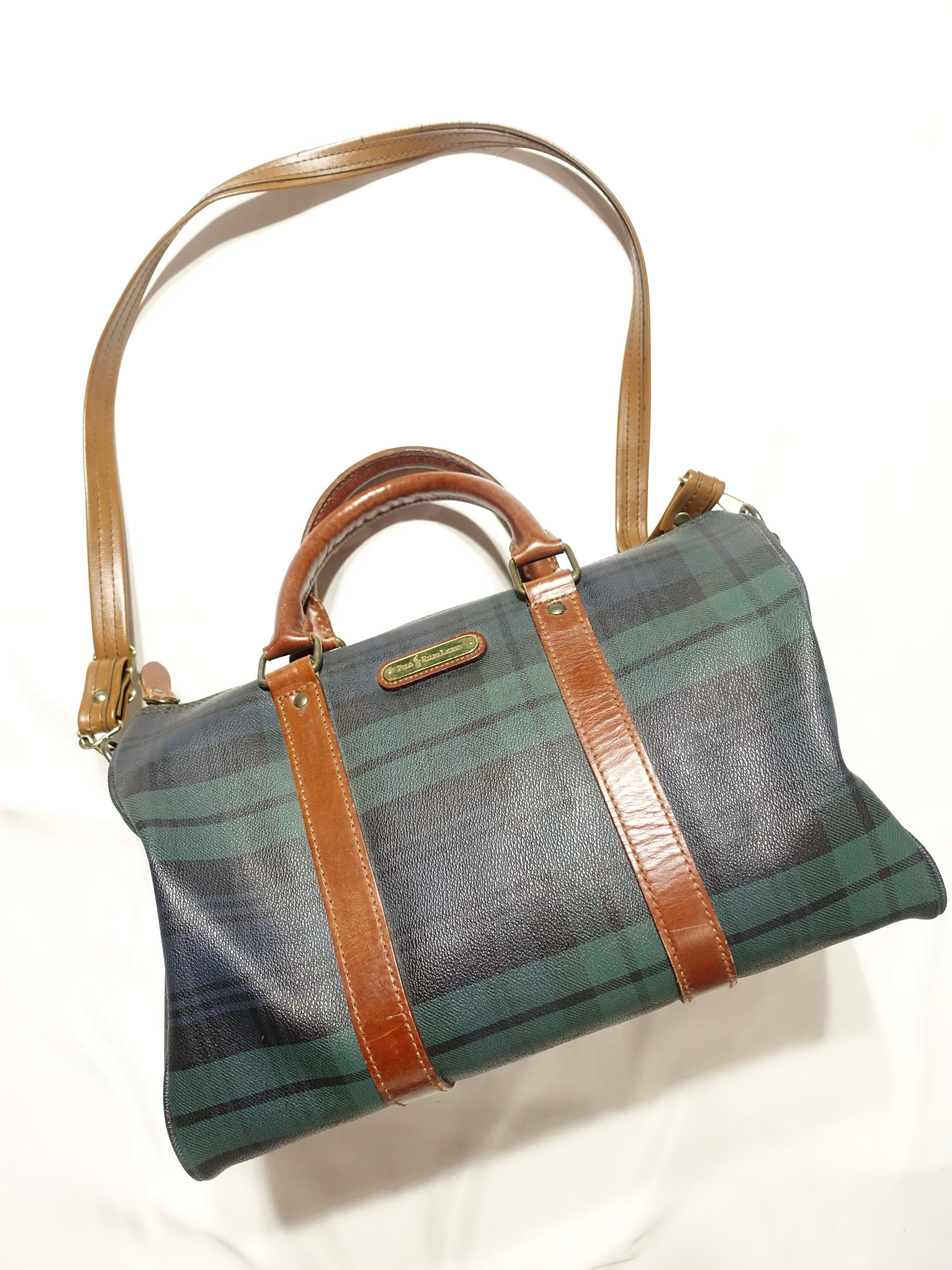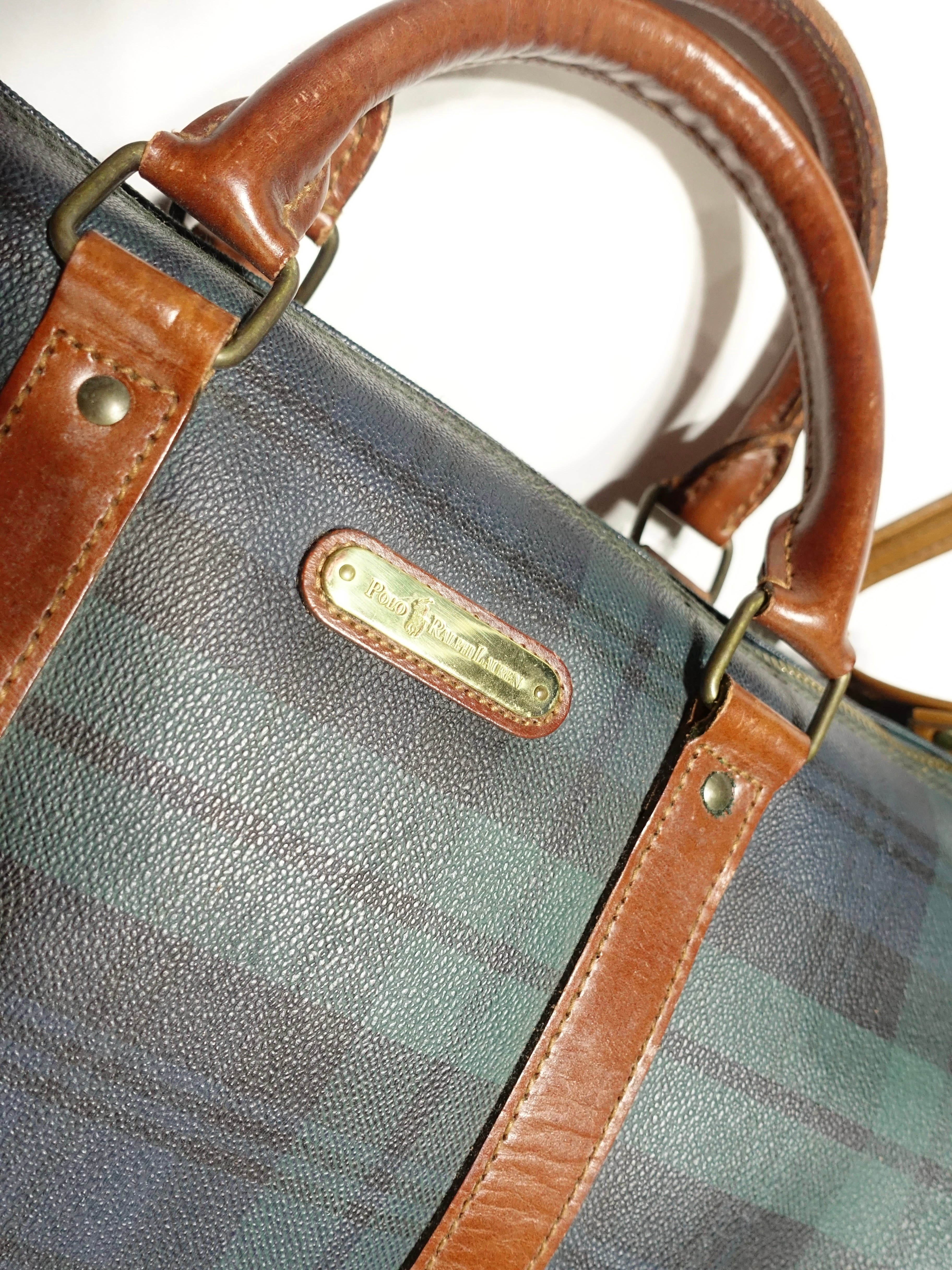 本体は耐久性の高いPVCコーティングキャンバス素材で、傷や汚れがつきにくく、非常にタフな作りです。ストラップやパイピングには本革(レザー)が使用されており、ヴィンテージならではの風合いも楽しめます。