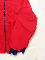 鮮やかなレッドのシェルに、襟元や袖口から覗くネイビーのフリースライナーが映える、絶妙な配色が特徴です。