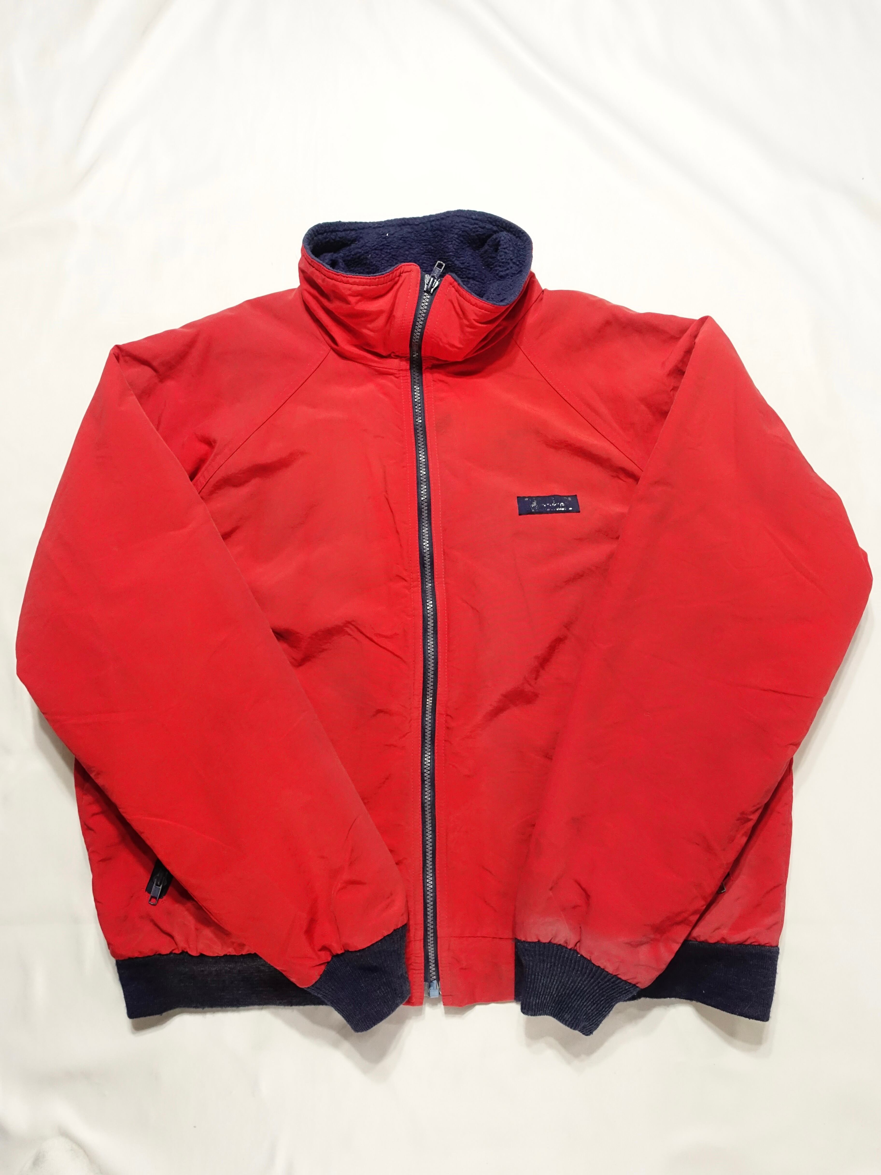 鮮やかなレッドのシェルに、襟元や袖口から覗くネイビーのフリースライナーが映える、絶妙な配色が特徴です。