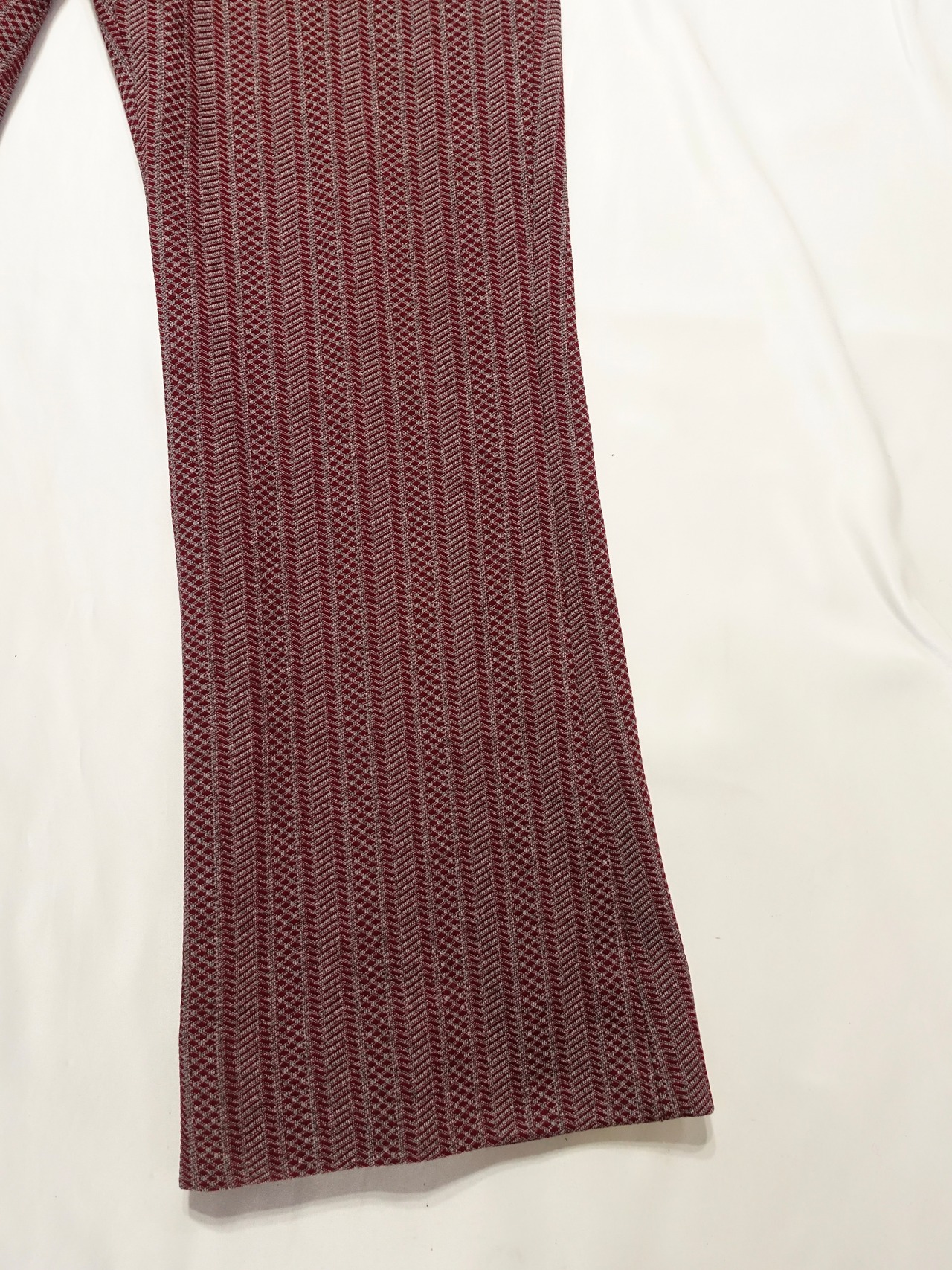 素材感は柔らかく、ストレッチも効いているため、見た目以上に快適な履き心地を実現しています。ポリエステル素材が主流だった当時ならではの、レトロでどこかサイケデリックな雰囲気も魅力です。