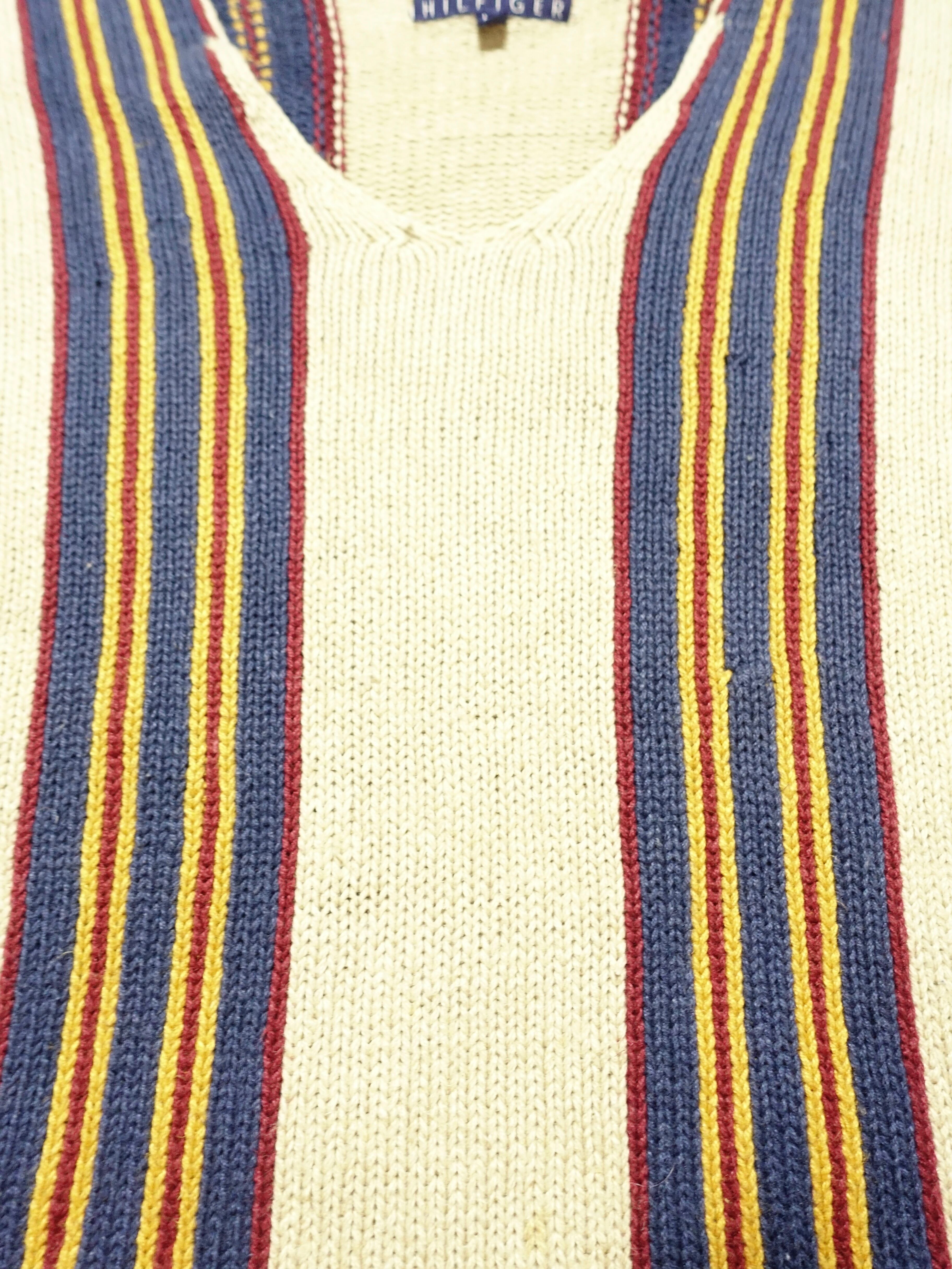 ナチュラルなベージュ地に、鮮やかなレッドとブルーのストライプが映えるマルチカラーデザイン。