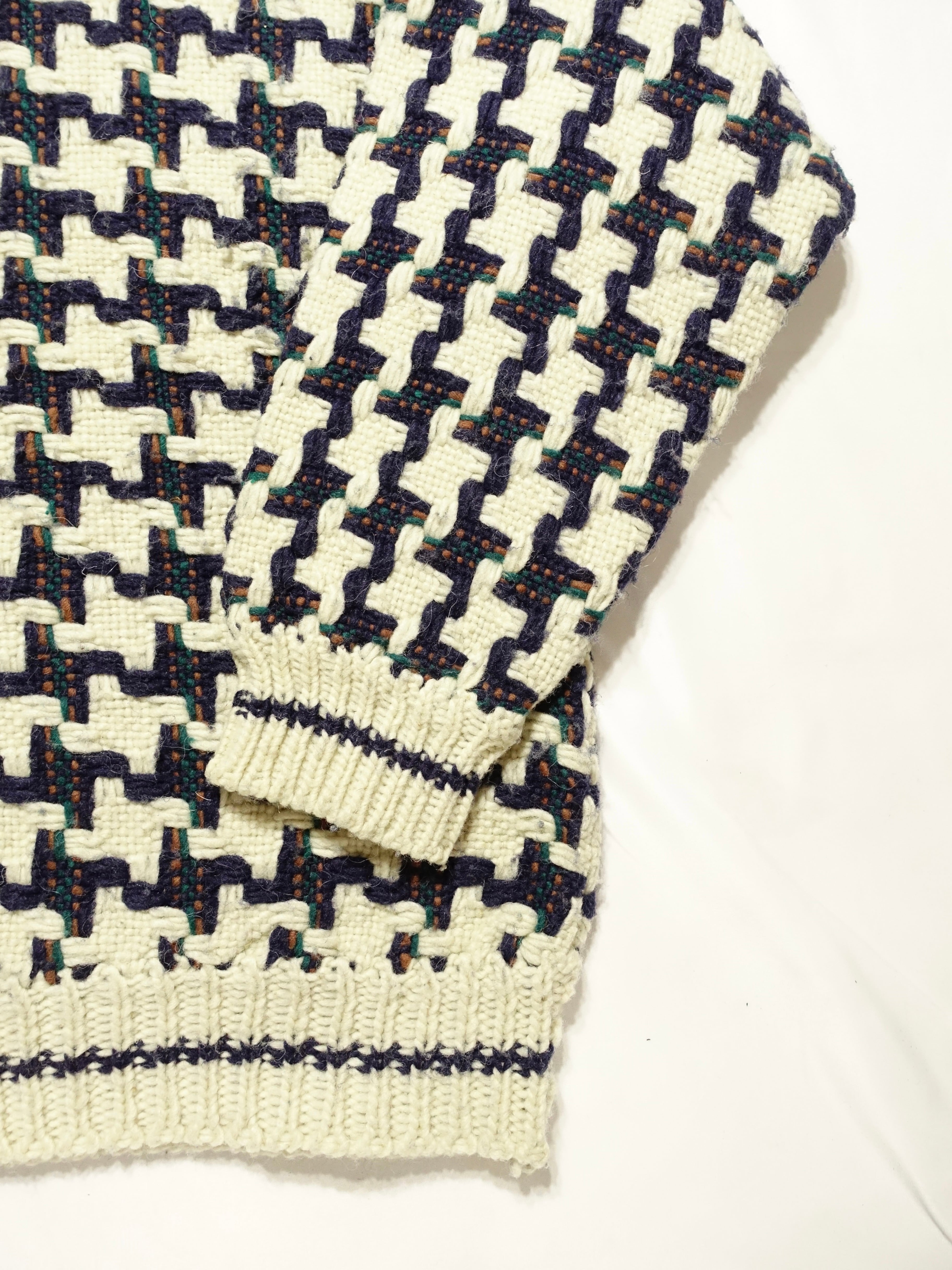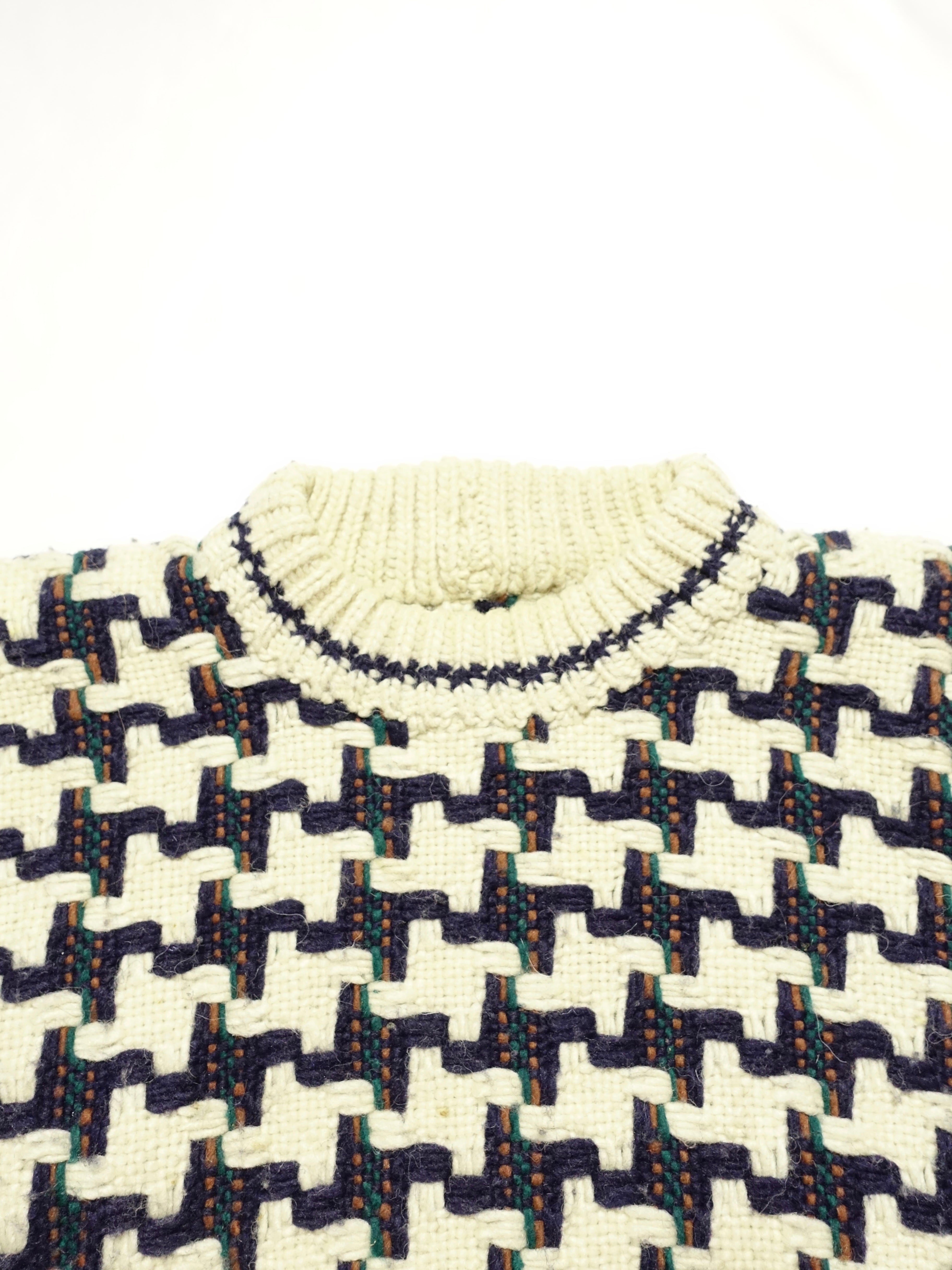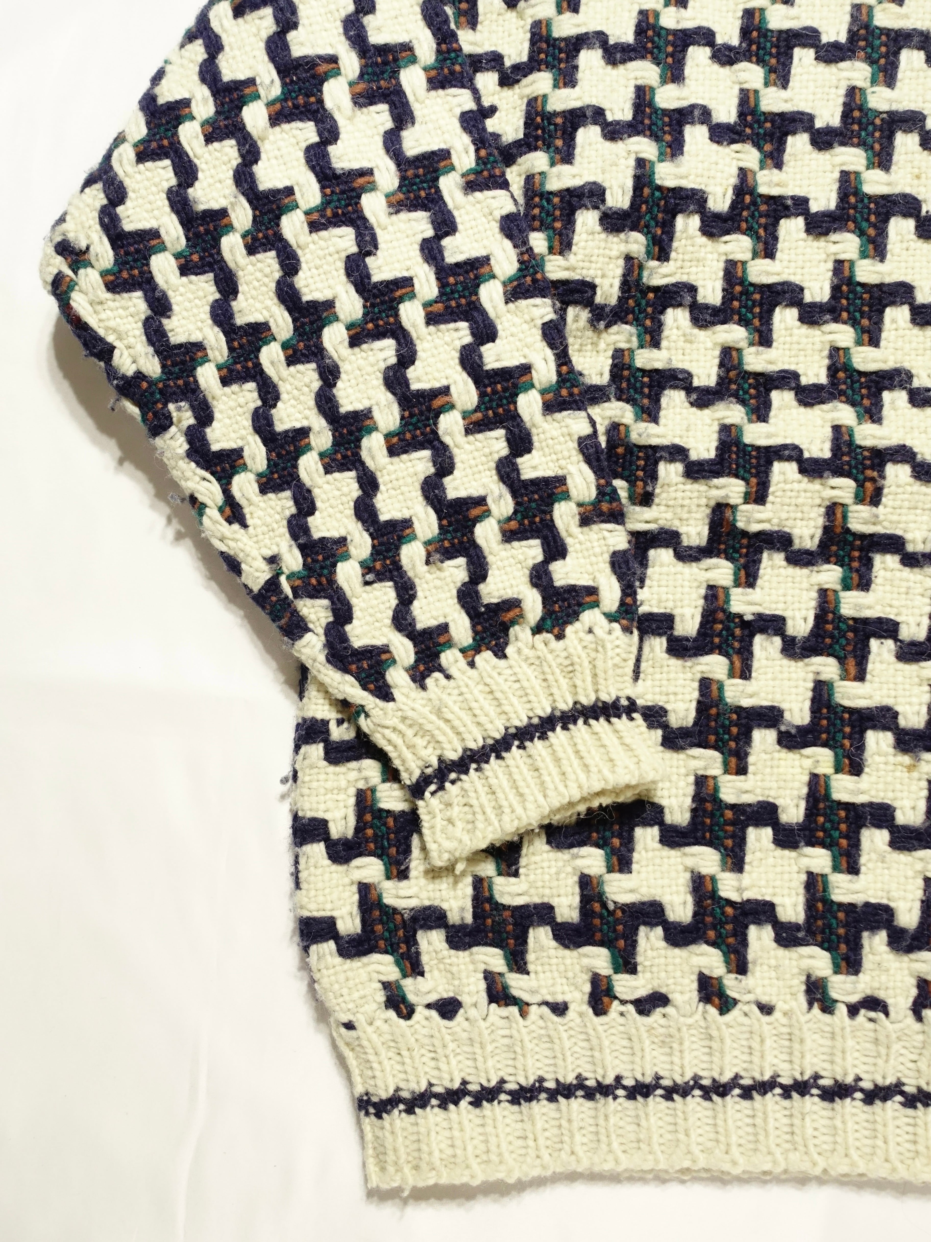 温かみのある手編みの風合いが魅力。ネイビーとアイボリーの千鳥格子柄(ハウンドトゥース柄)が目を引く、ウールハンドニットセーター。
