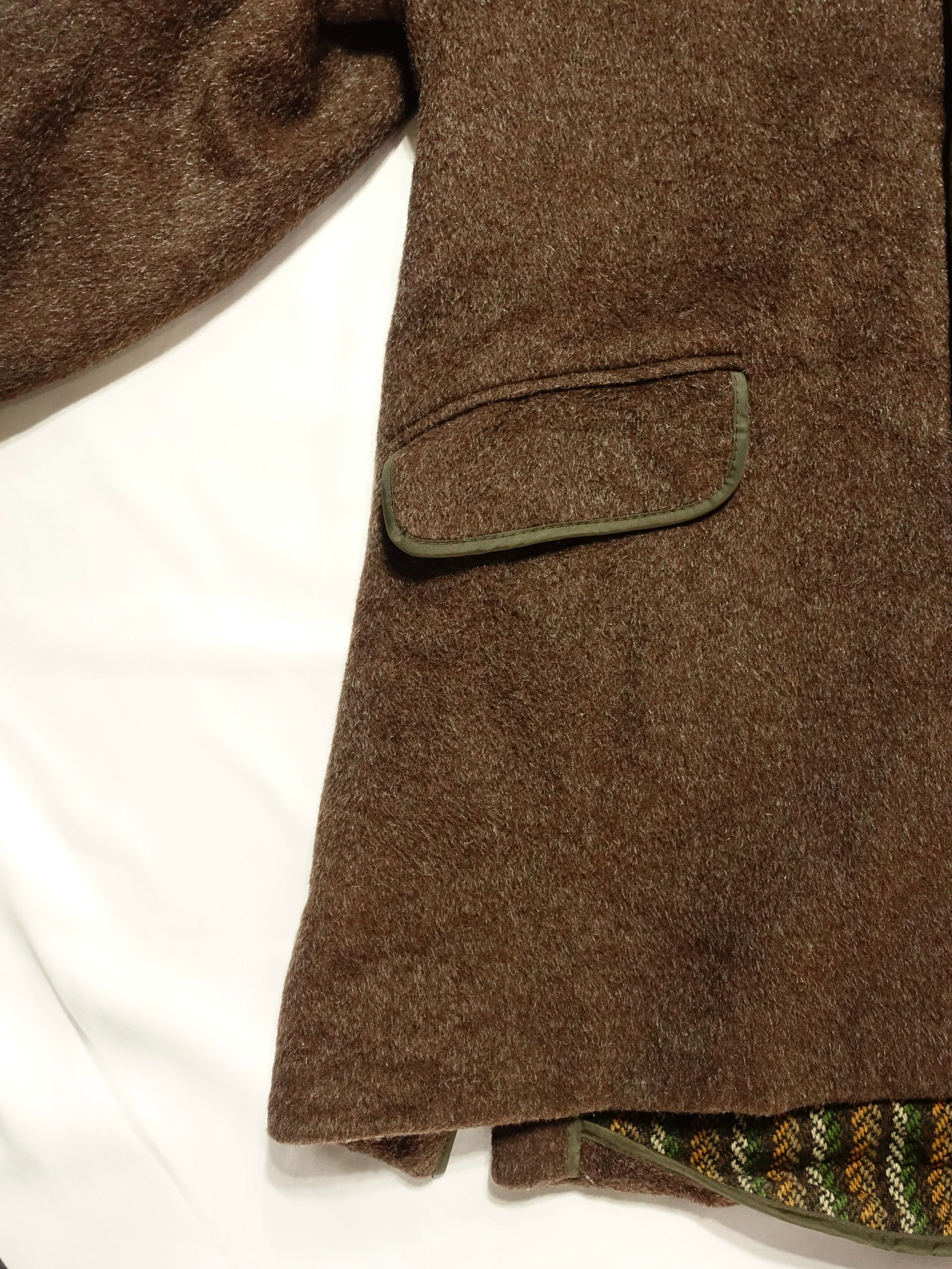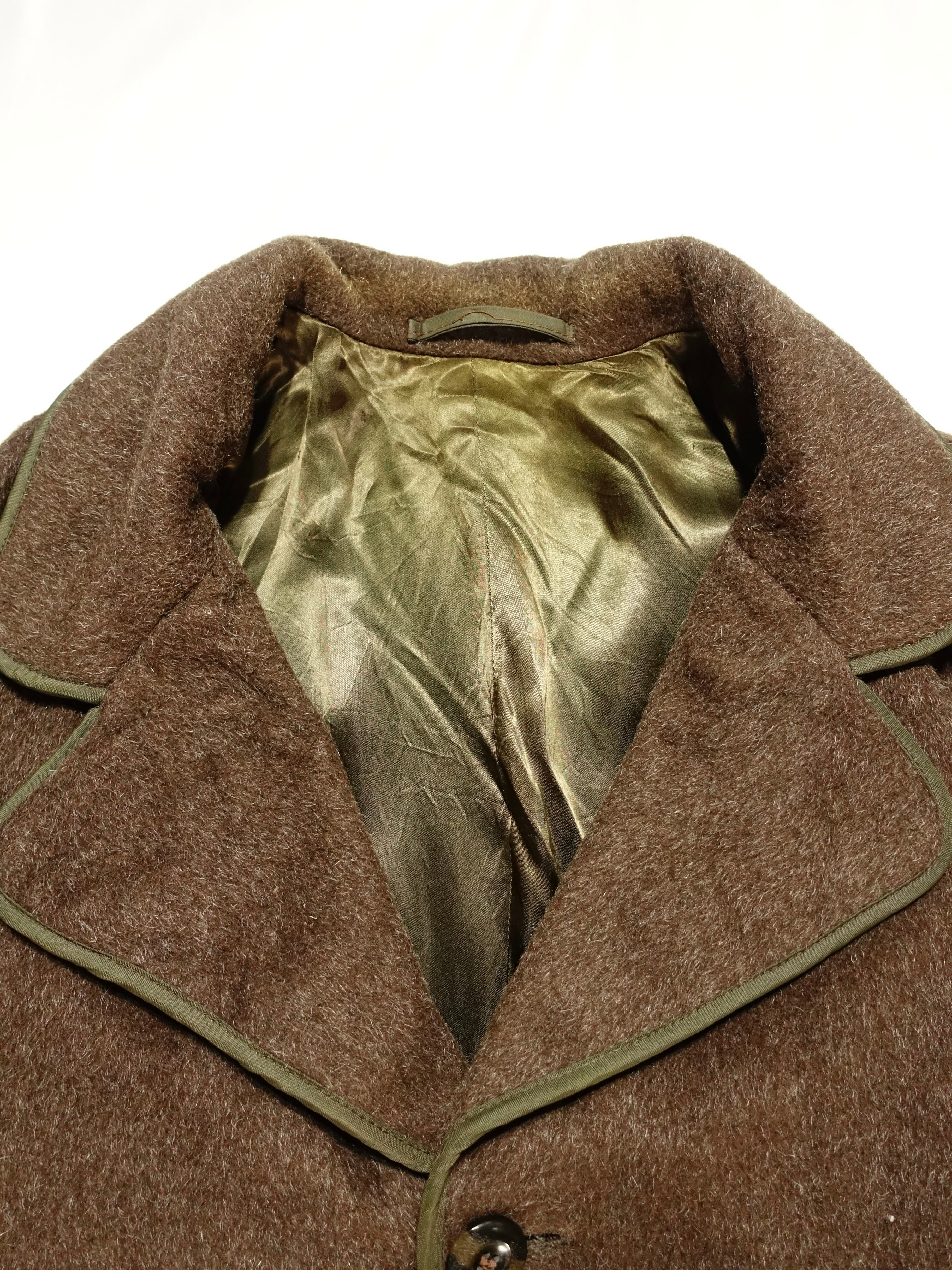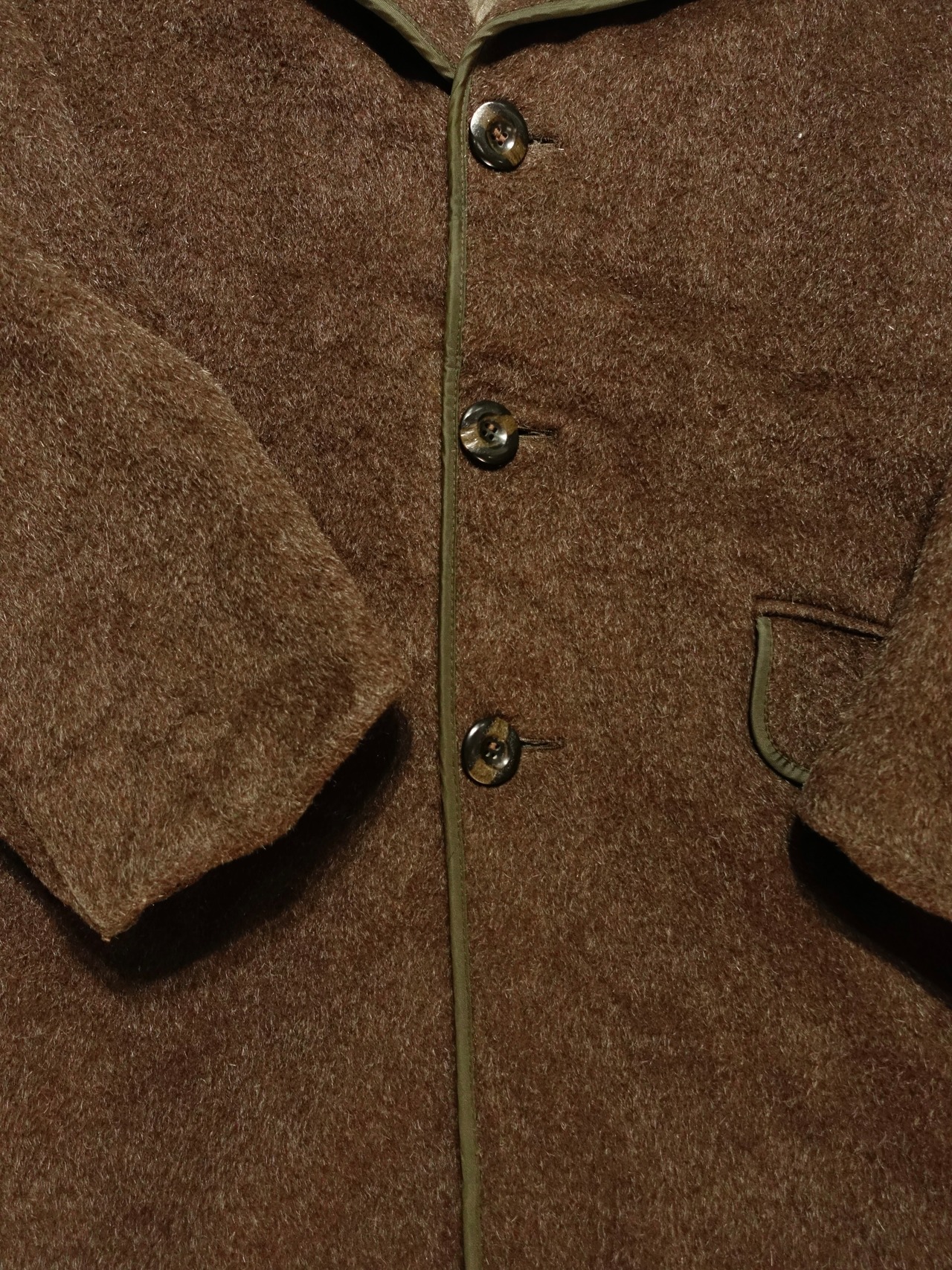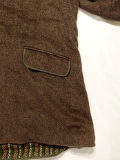 温かみのあるブラウン系のウール生地に、襟やポケット、前立て部分のグリーンのパイピングが効いたデザインが特徴的。