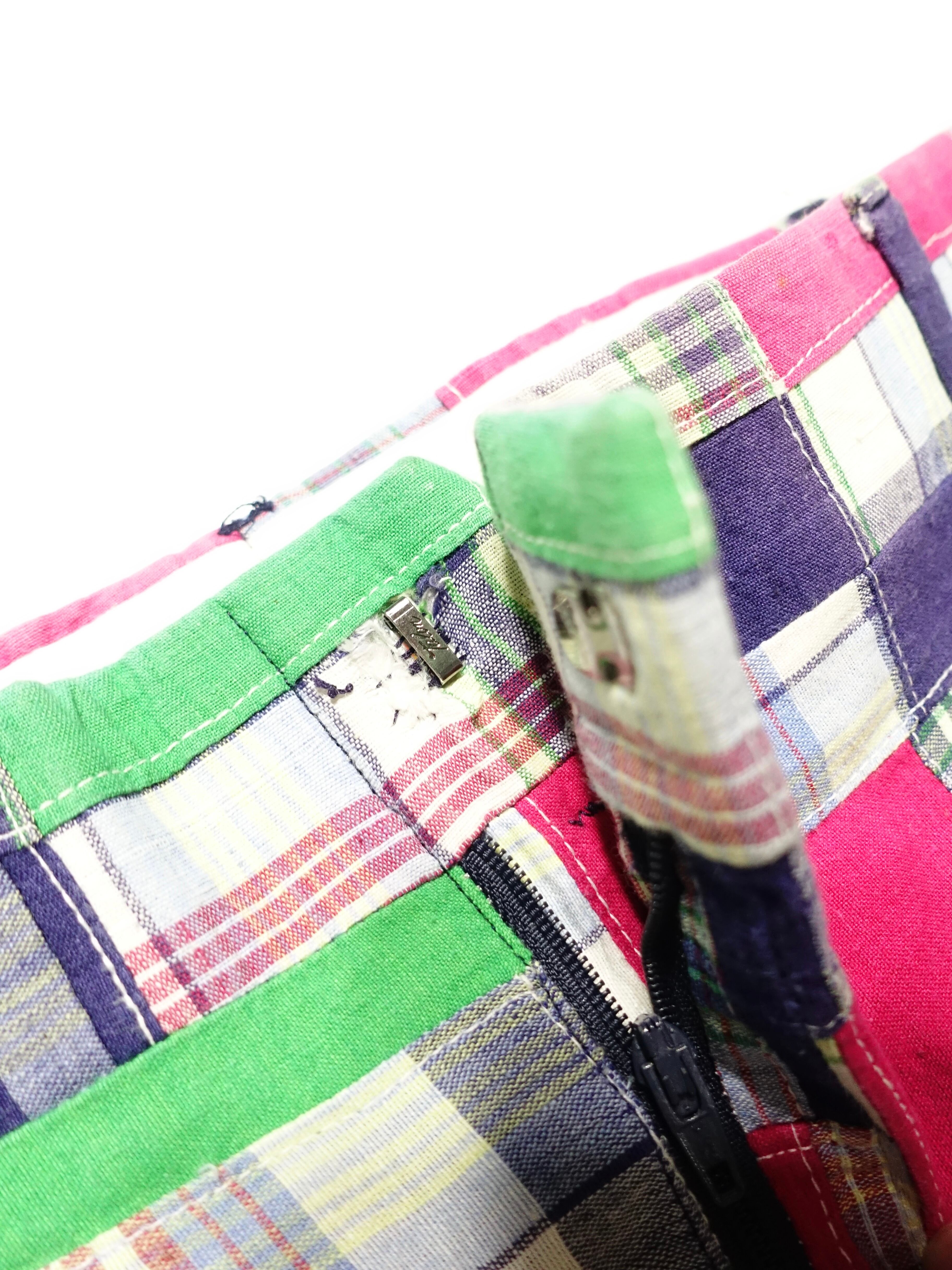 様々なチェック柄のマドラス生地がパッチワーク状に組み合わされたデザインは、70年代のヒッピーカルチャーやサマースタイルを象徴するアイテム。