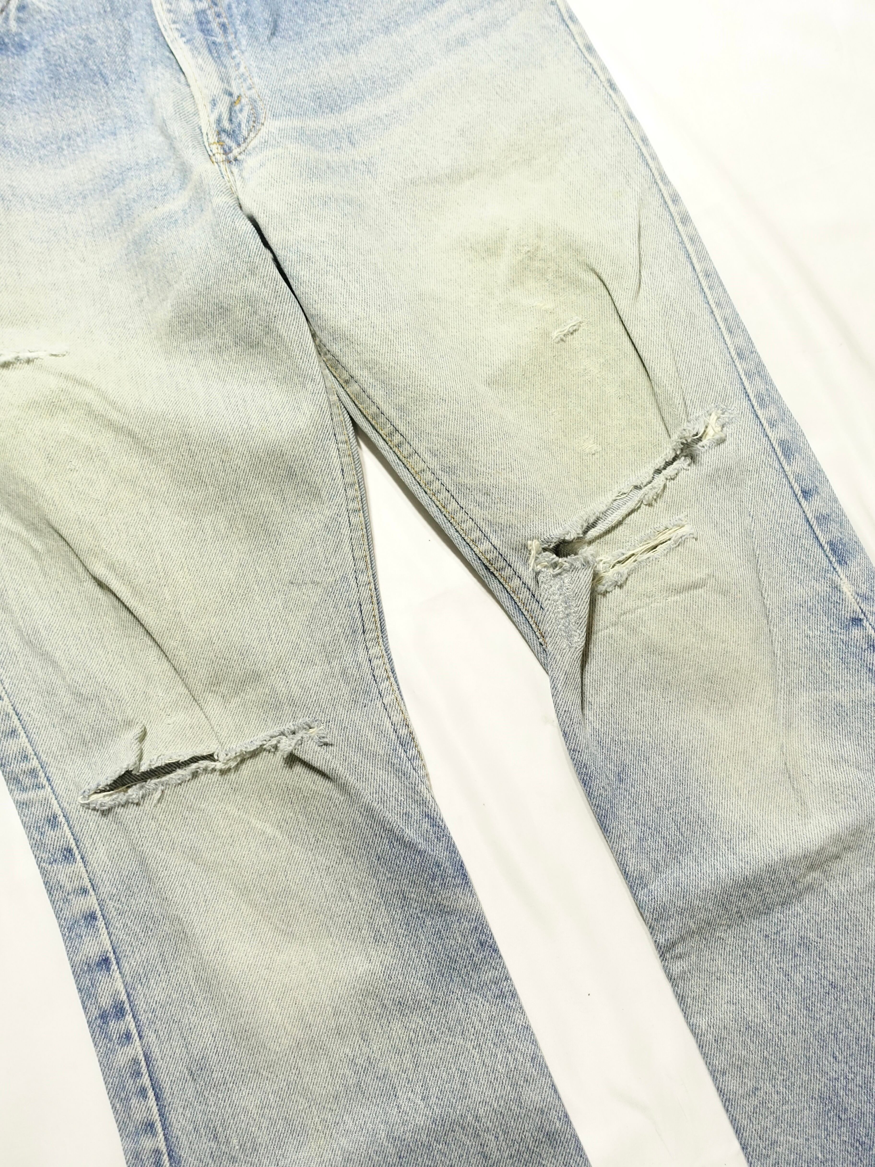 今回のアイテムは、雰囲気の良いライトオンスデニムで、長年穿き込まれたことによる美しい色落ち(フェード)と、膝部分のダメージが抜群の風合いを醸し出しています。