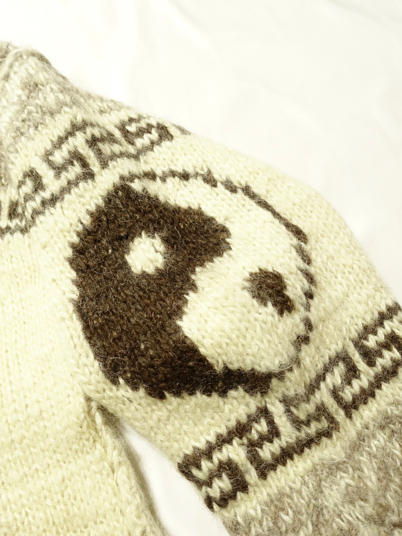 ブラックの陰陽マークと特徴的なパターンが編み込まれた、インパクト抜群の一着です。