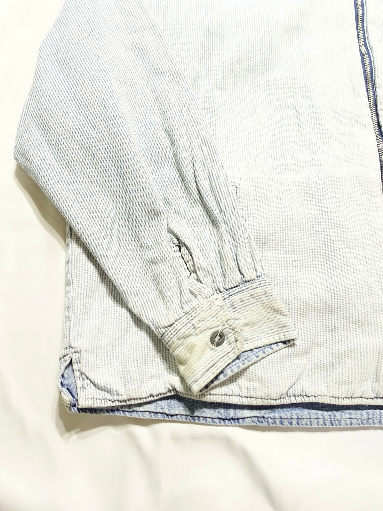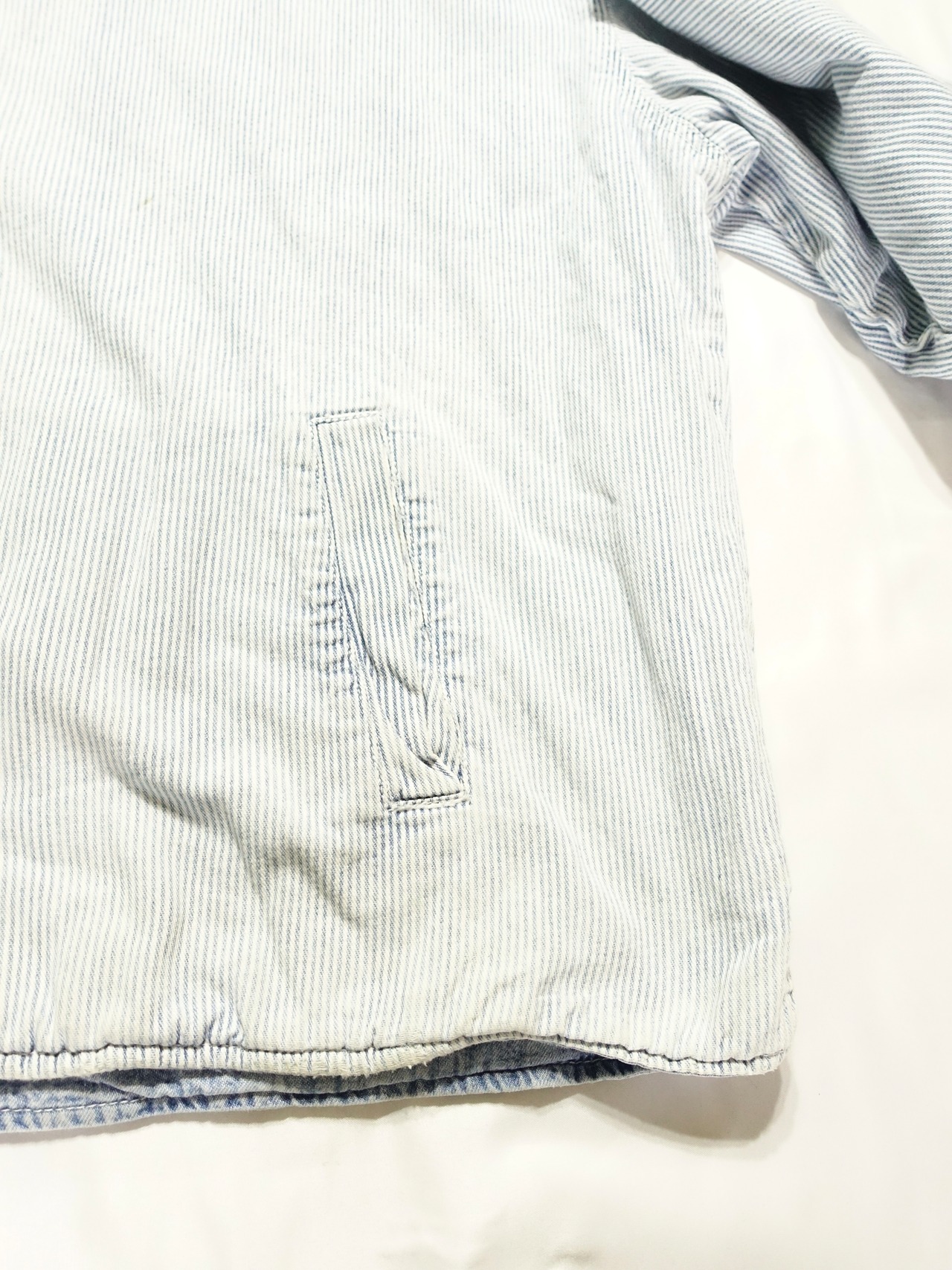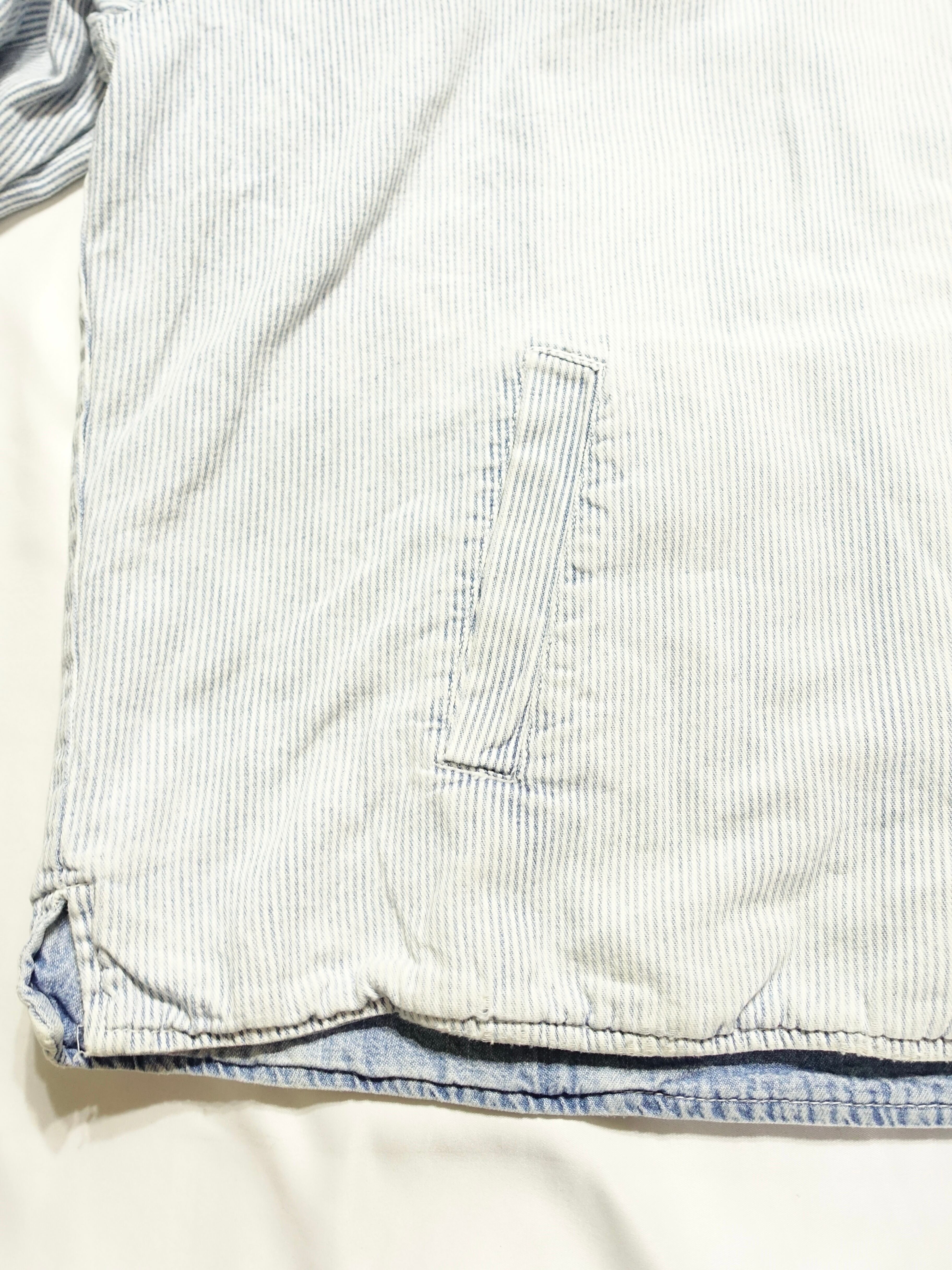 デニム面はアイスブルーの色落ちが雰囲気抜群で、裏返すと爽やかなストライプ柄のコットン生地が現れる、万能アイテム。