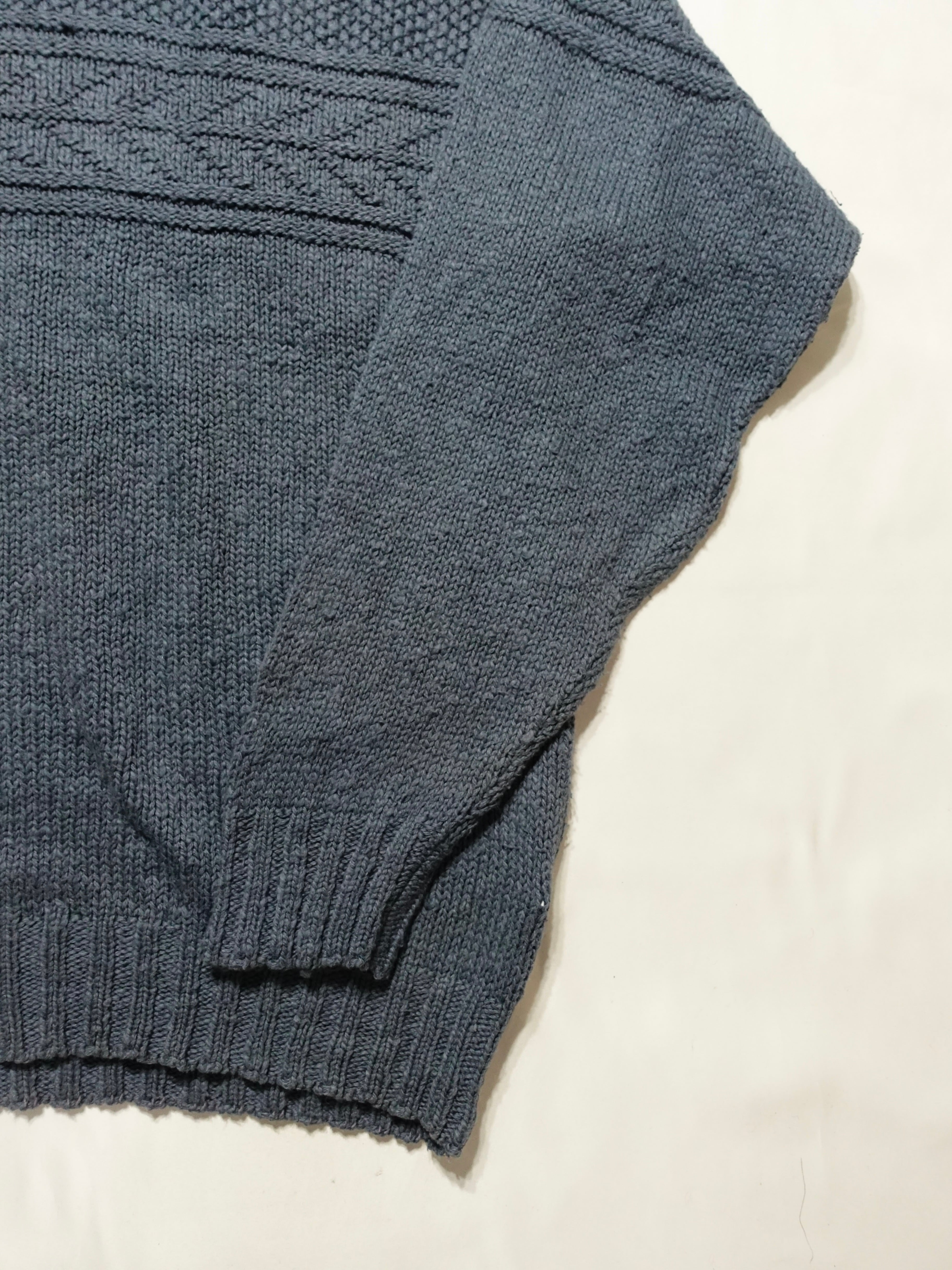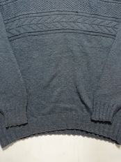 中央部分に施されたランダムなケーブル編みや変則編みといった凝った織り柄が特徴的で、シンプルなクルーネックながら存在感があります。