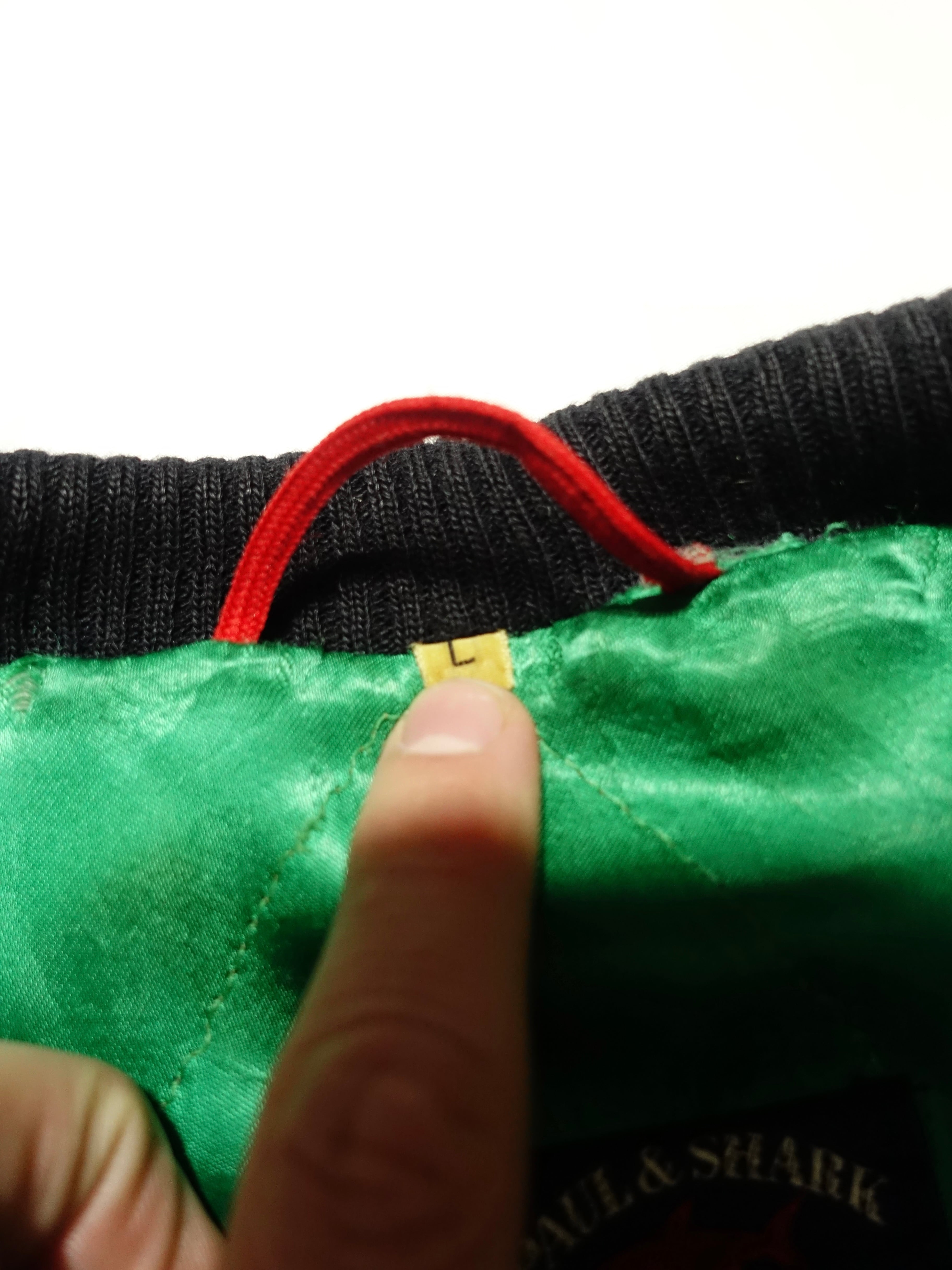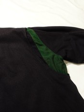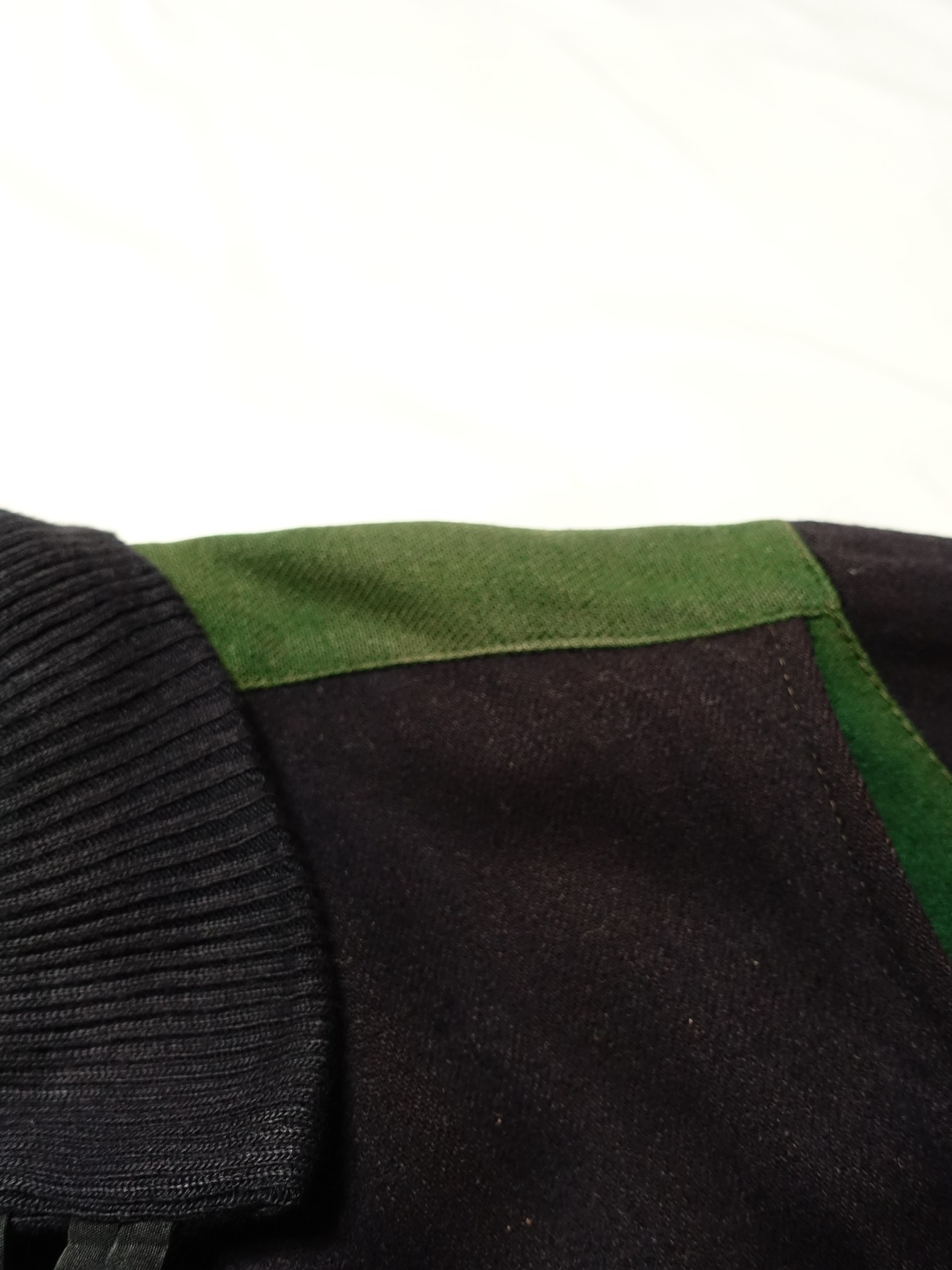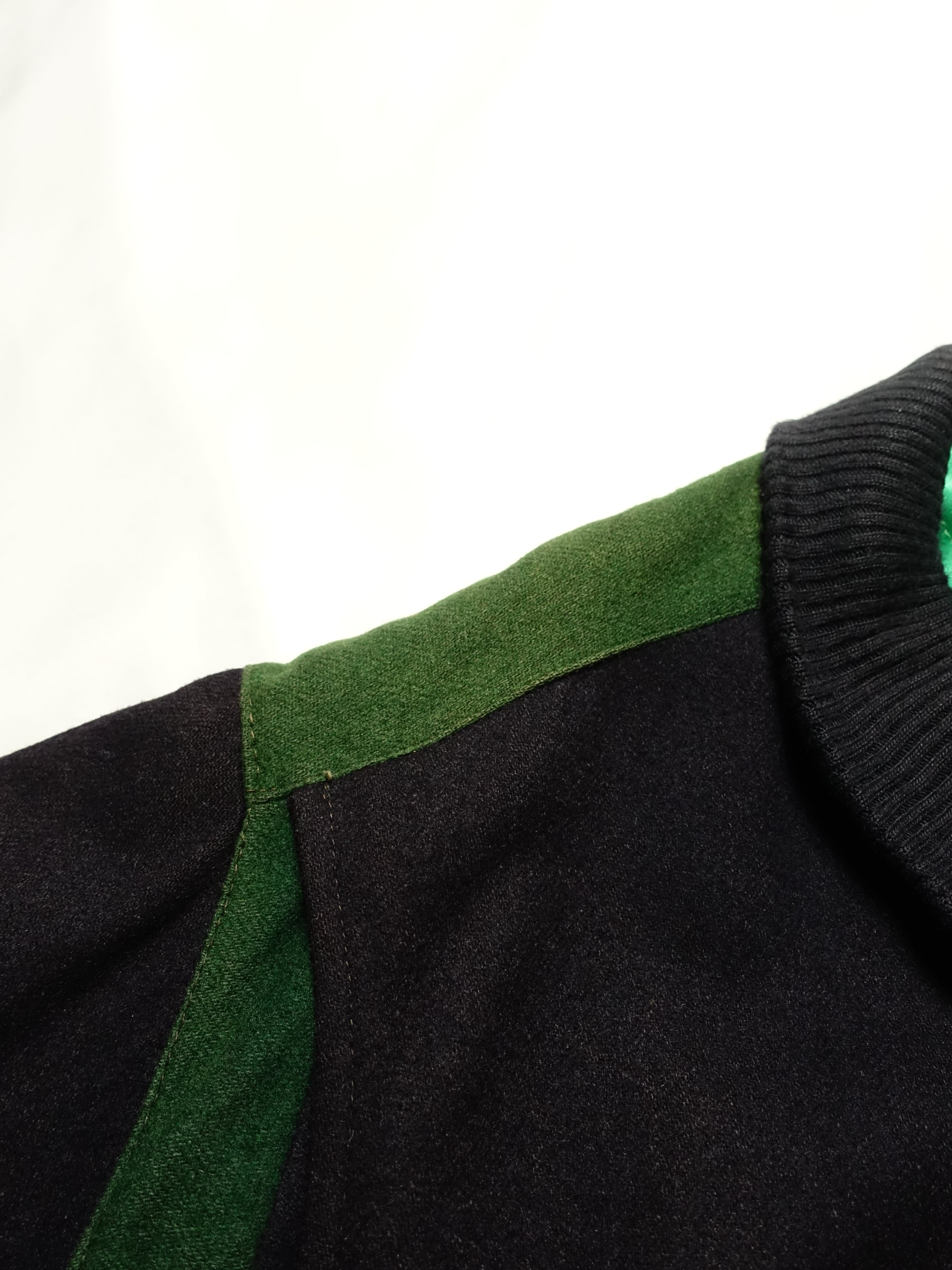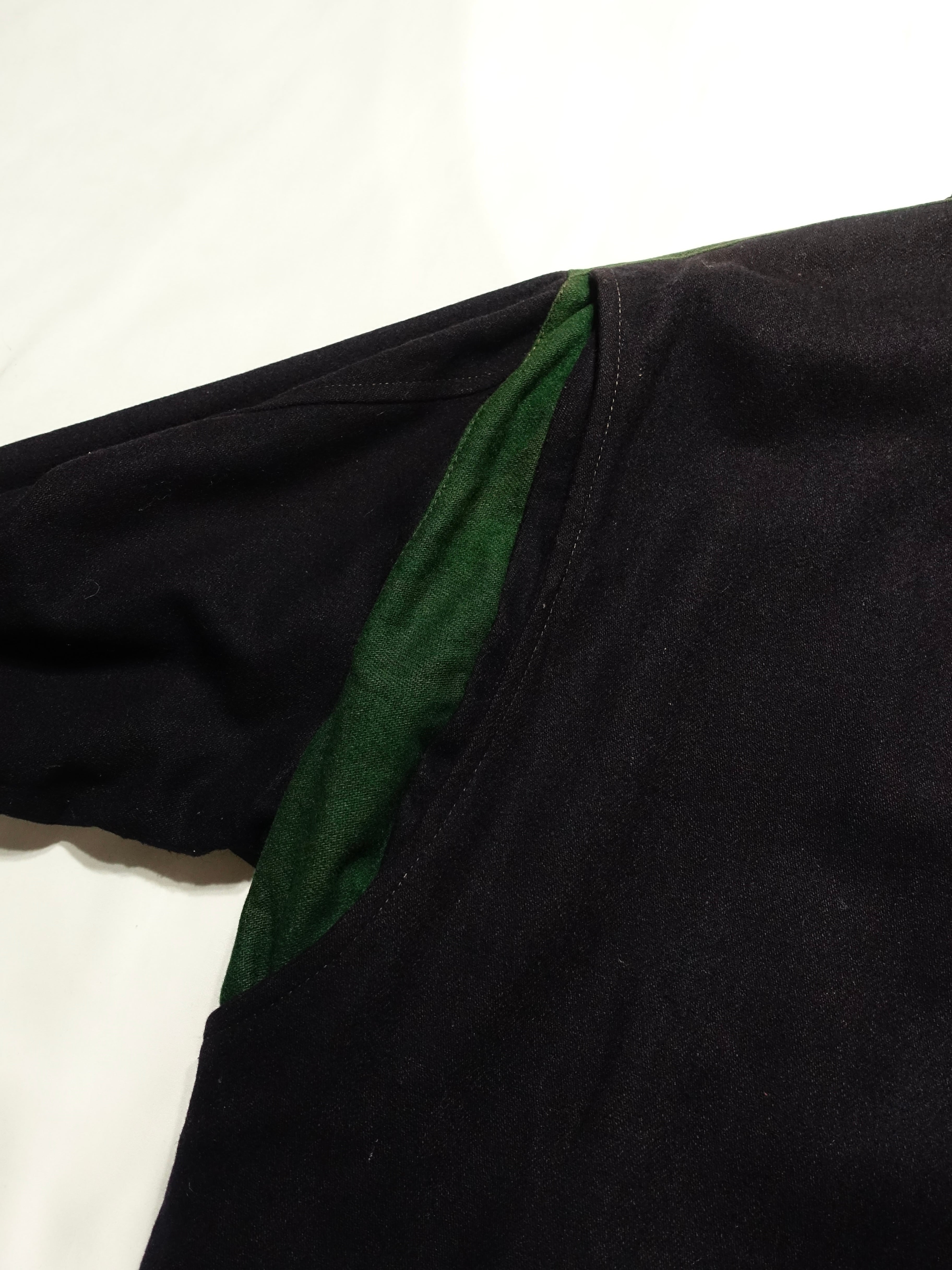 襟元のグリーンの切り替えと内側の鮮やかなライニングが特徴的で、細部にまでこだわりが感じられます。