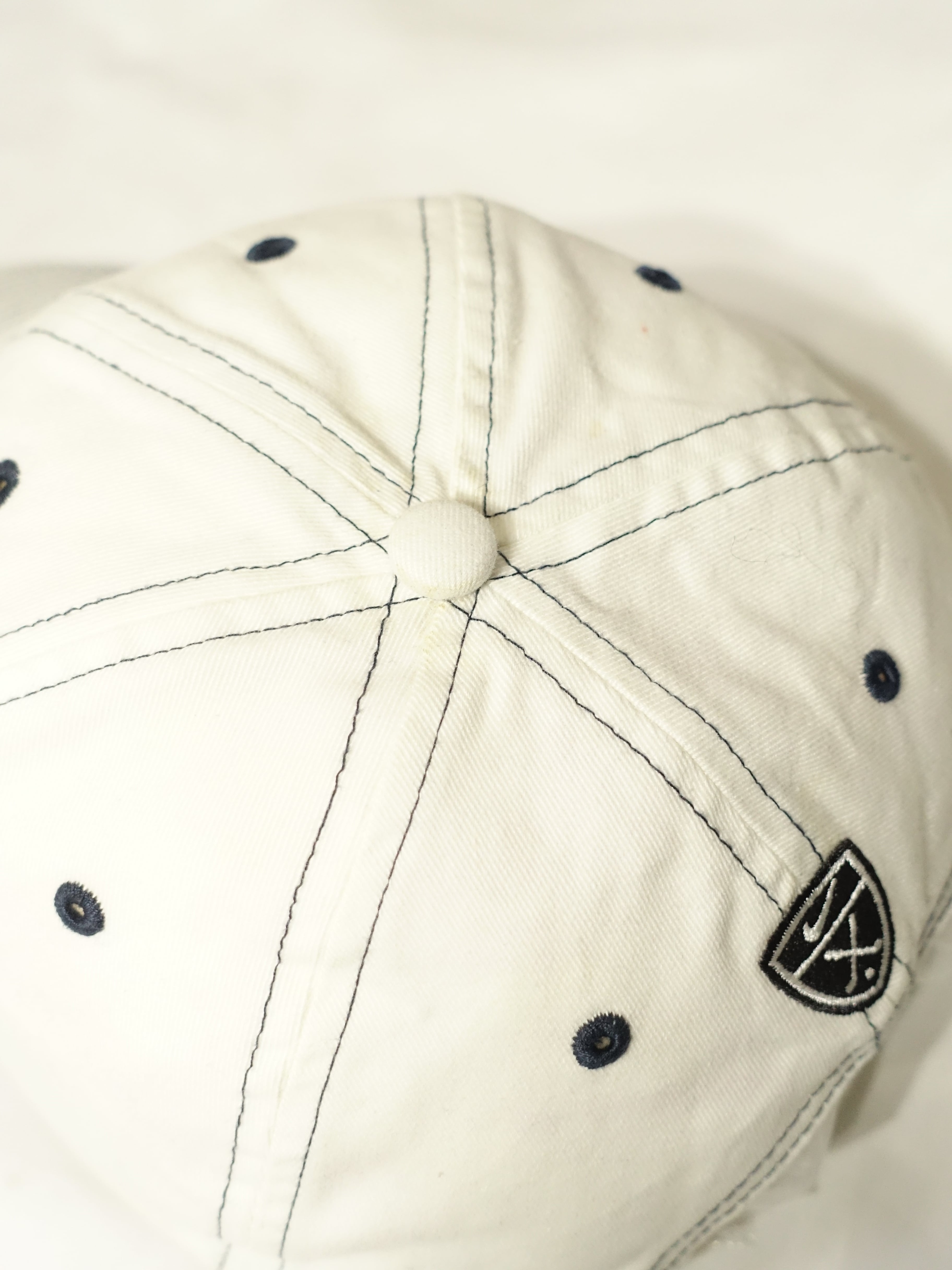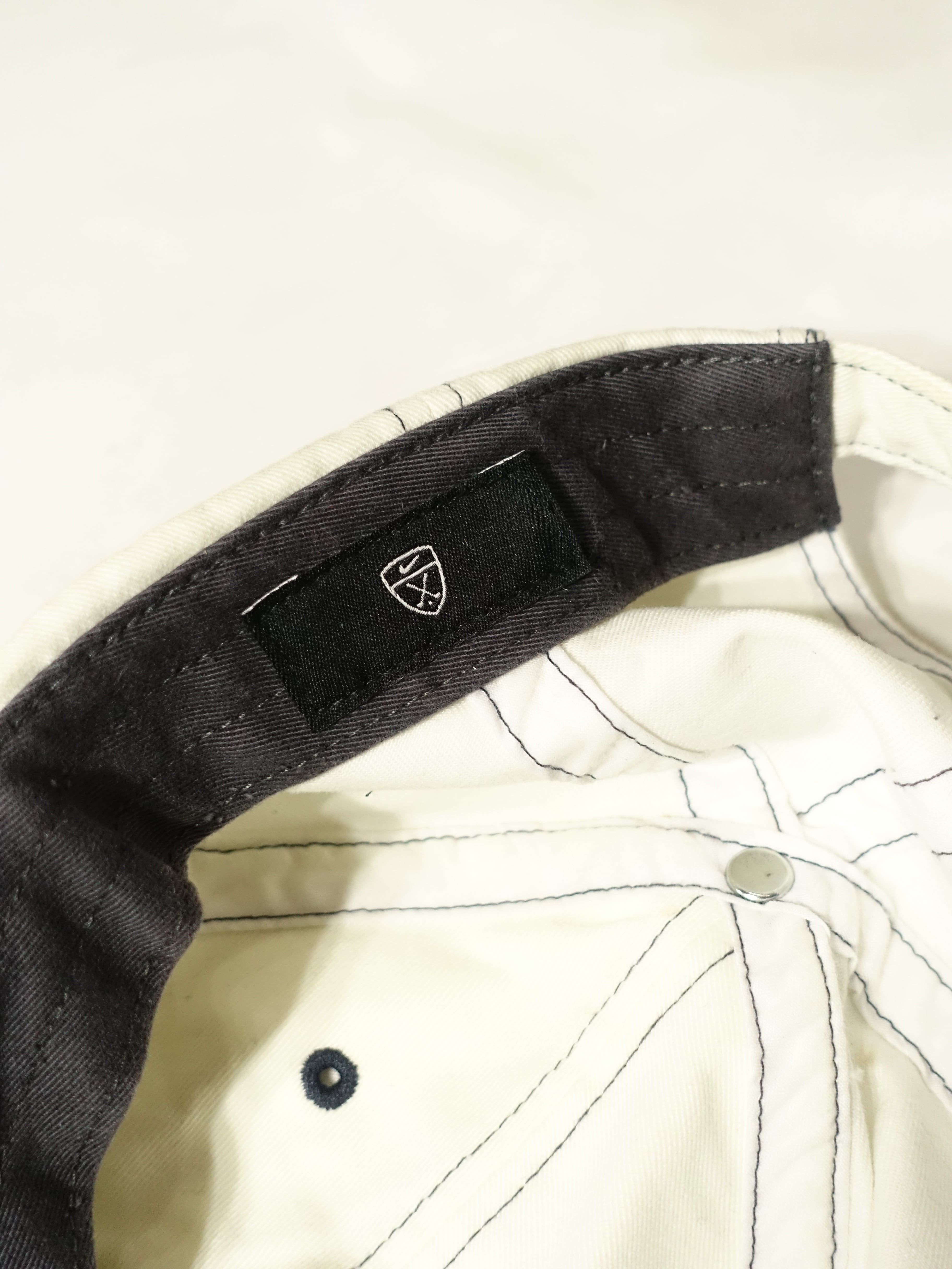 清潔感のあるホワイトのコットン地に、ブラックのステッチが力強く走り、シンプルなキャップに奥行きと独特のギア感を与えています。