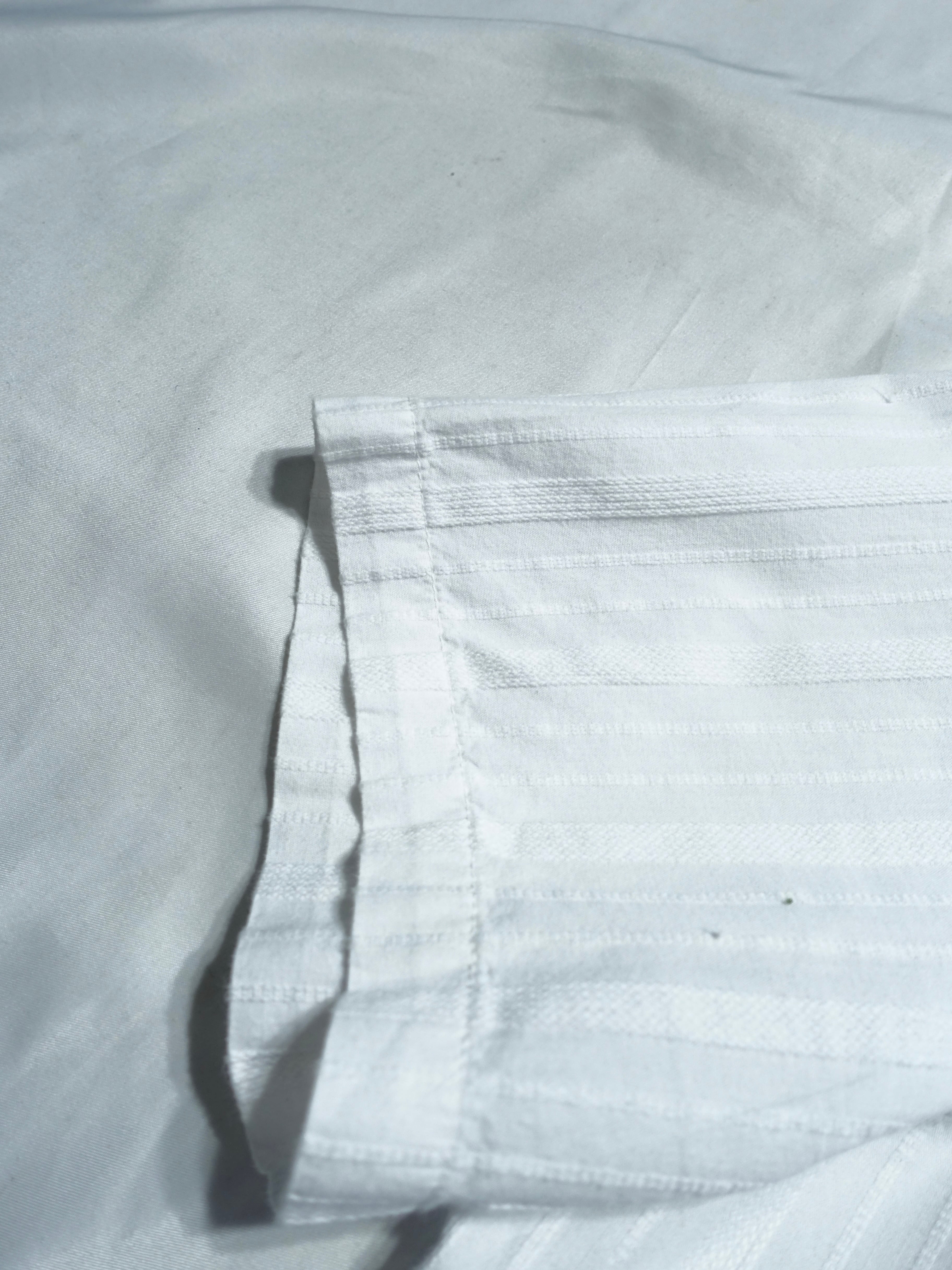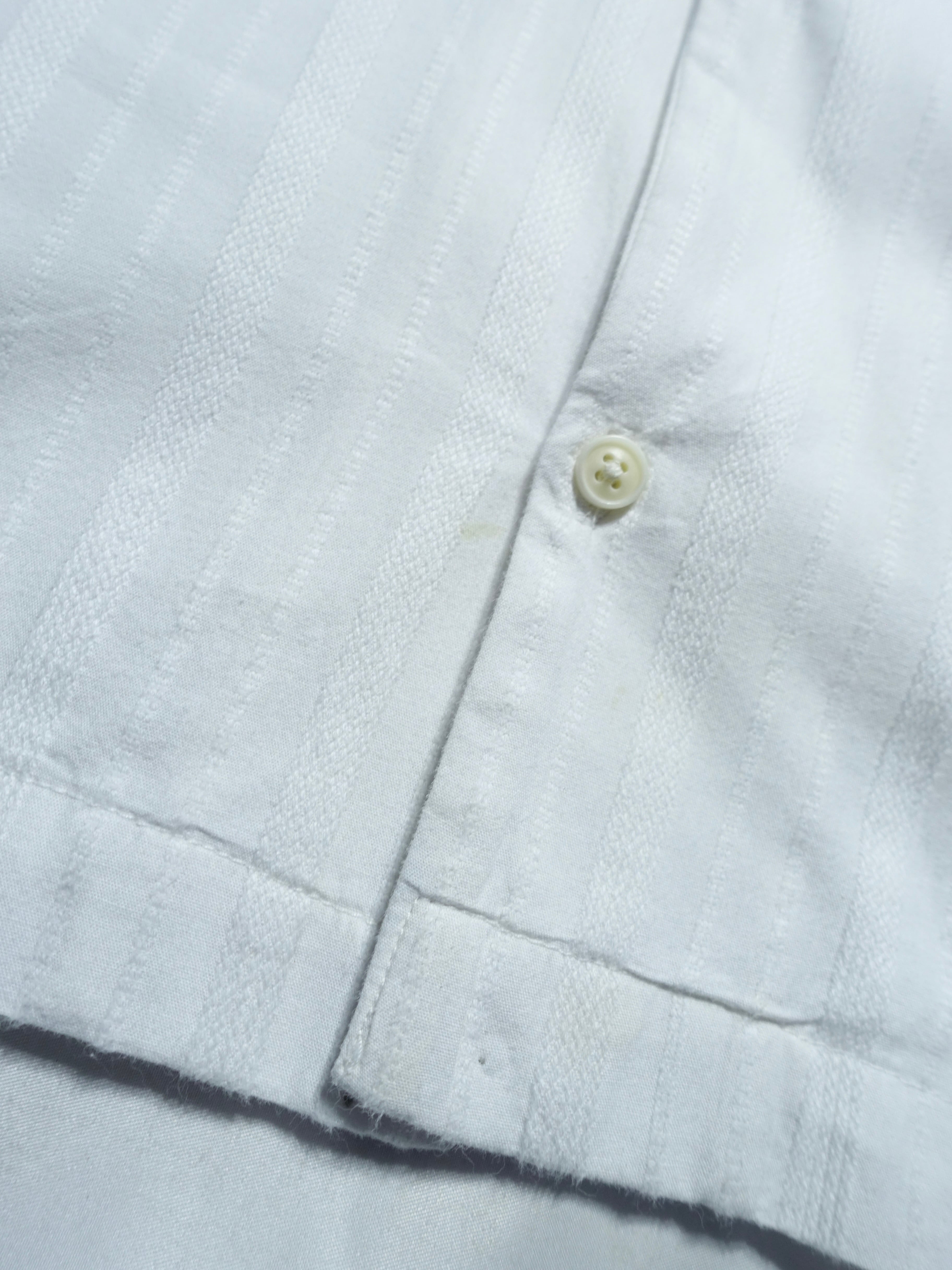 こちらは、清涼感のある白ボディに、同系色のドビー織りでストライプ柄を表現したオープンカラーシャツ。