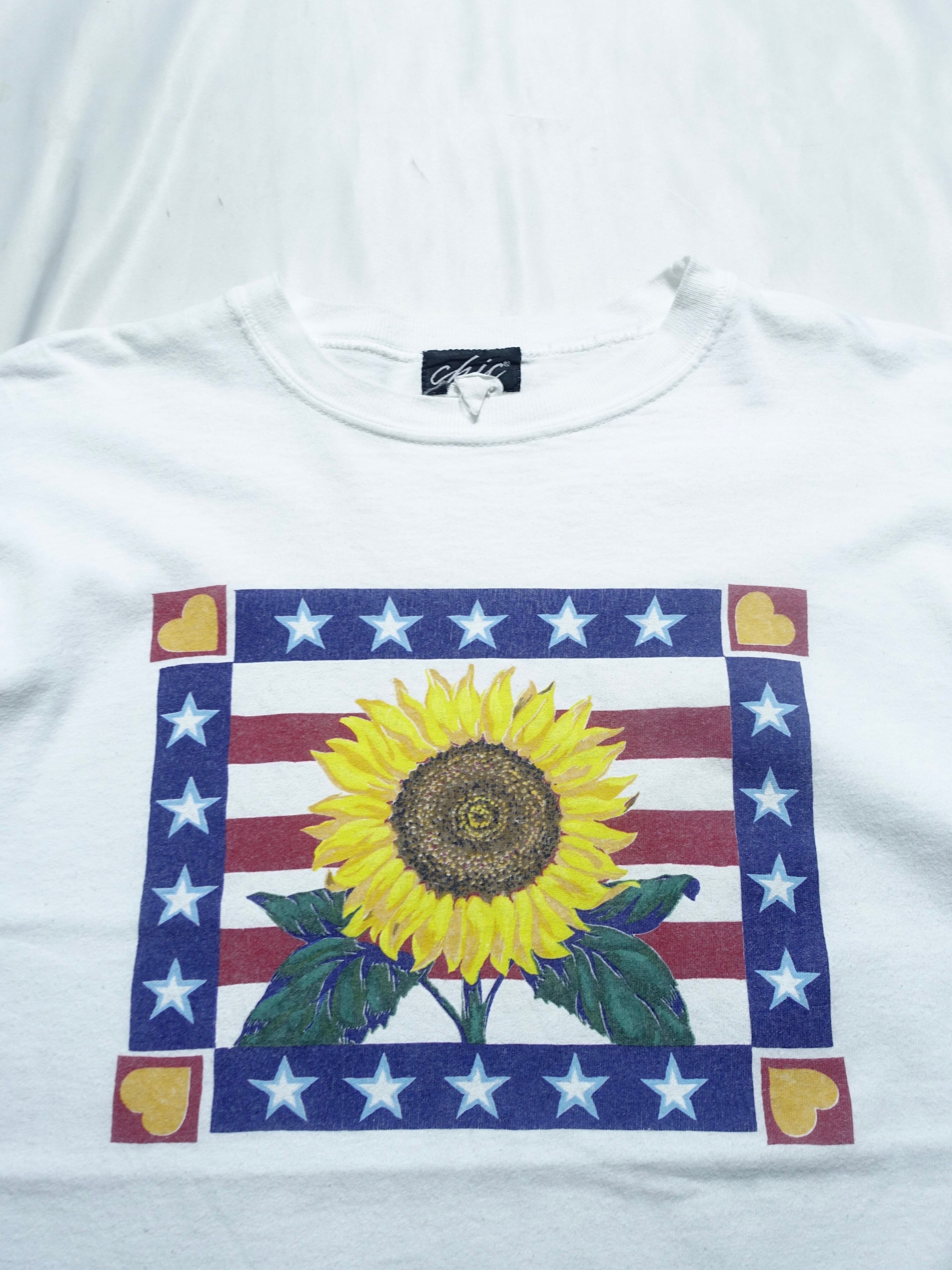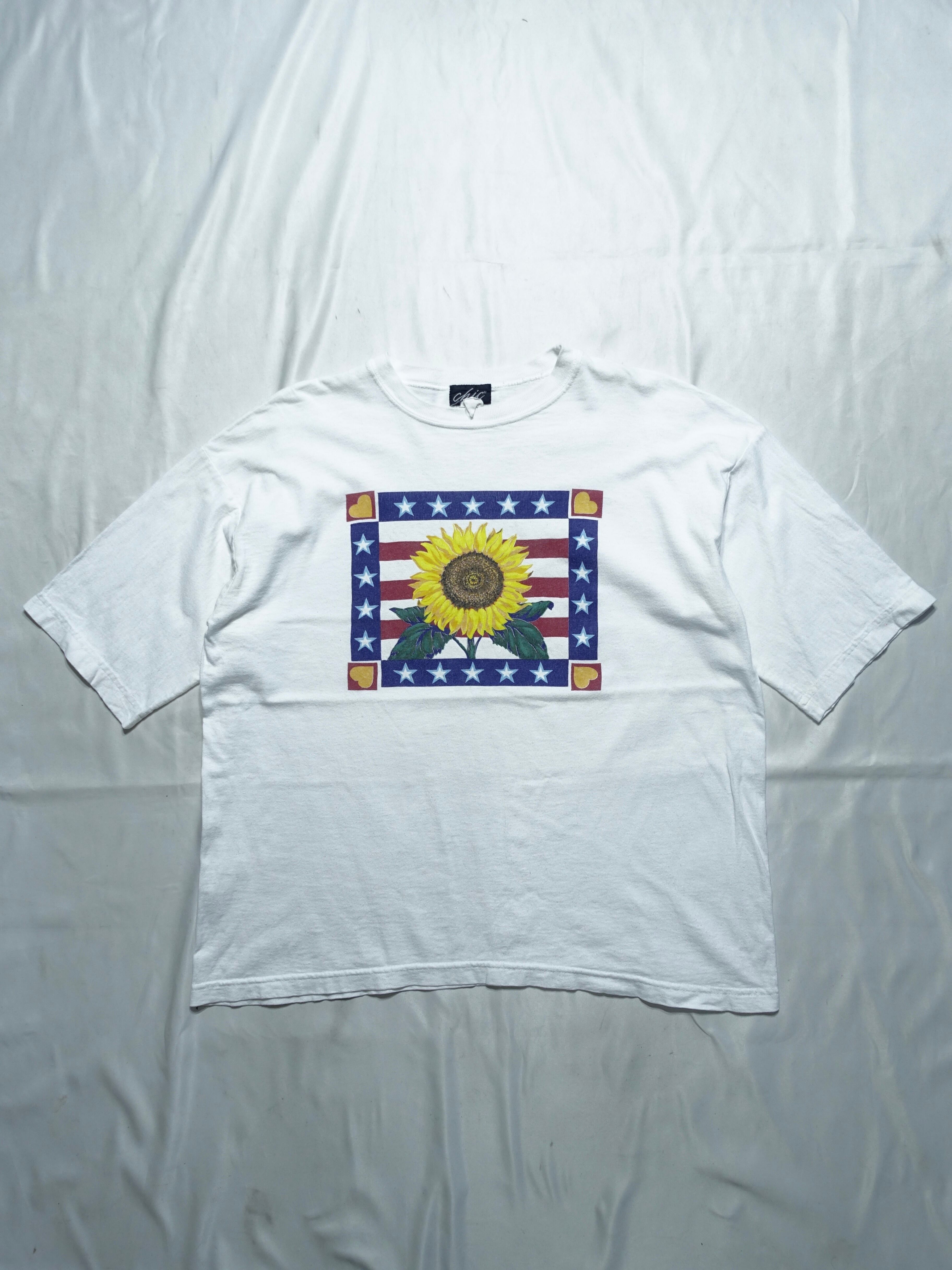 アメリカンフラッグと大輪のひまわりが目を引く、主役級のプリントTシャツ。